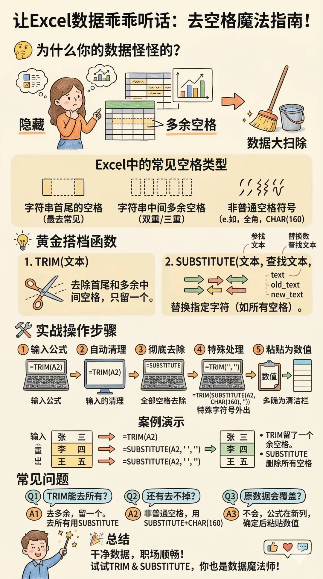 去除多余空格,就像给数据做个大扫除,干净整洁职场更顺畅!试试看TRIM和SUBSTITUTE这对黄金搭档,让你的Excel数据焕然一新。不信你敲个公式试试?操作小巧又高效,顿时感觉自己成了数据魔法师!觉得有用就点赞支持一下,或者留言告诉我你的“去空格”故事吧!下次揭秘更多Excel秘密,敬请期待~