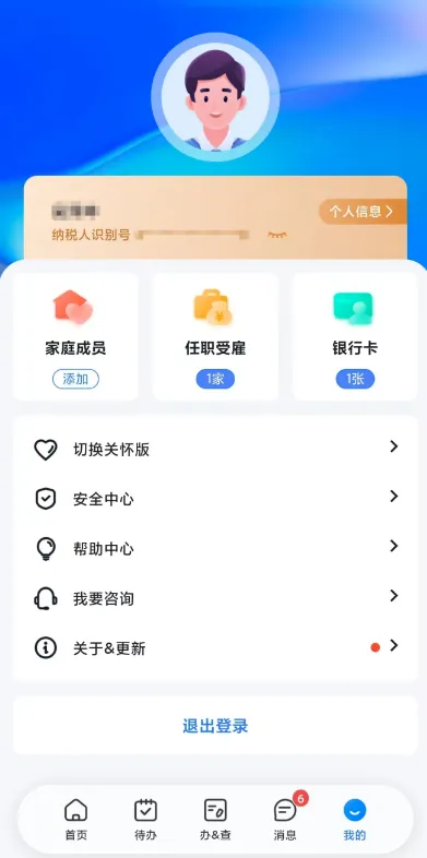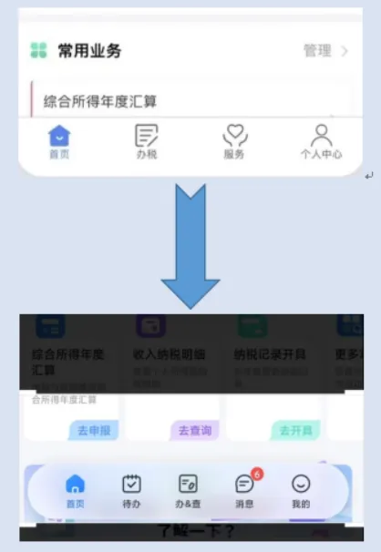 原本APP底端功能按键“首页”“办税”“服务”“个人中心”整合升级为“首页”“待办”“办&查”“消息”“我的”五大分区。
