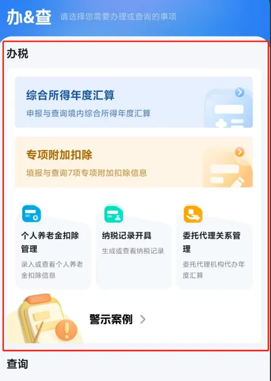 原本的“服务”和“办税”分区合并为“办&查”分区,您可以统一在这里办理和查询。