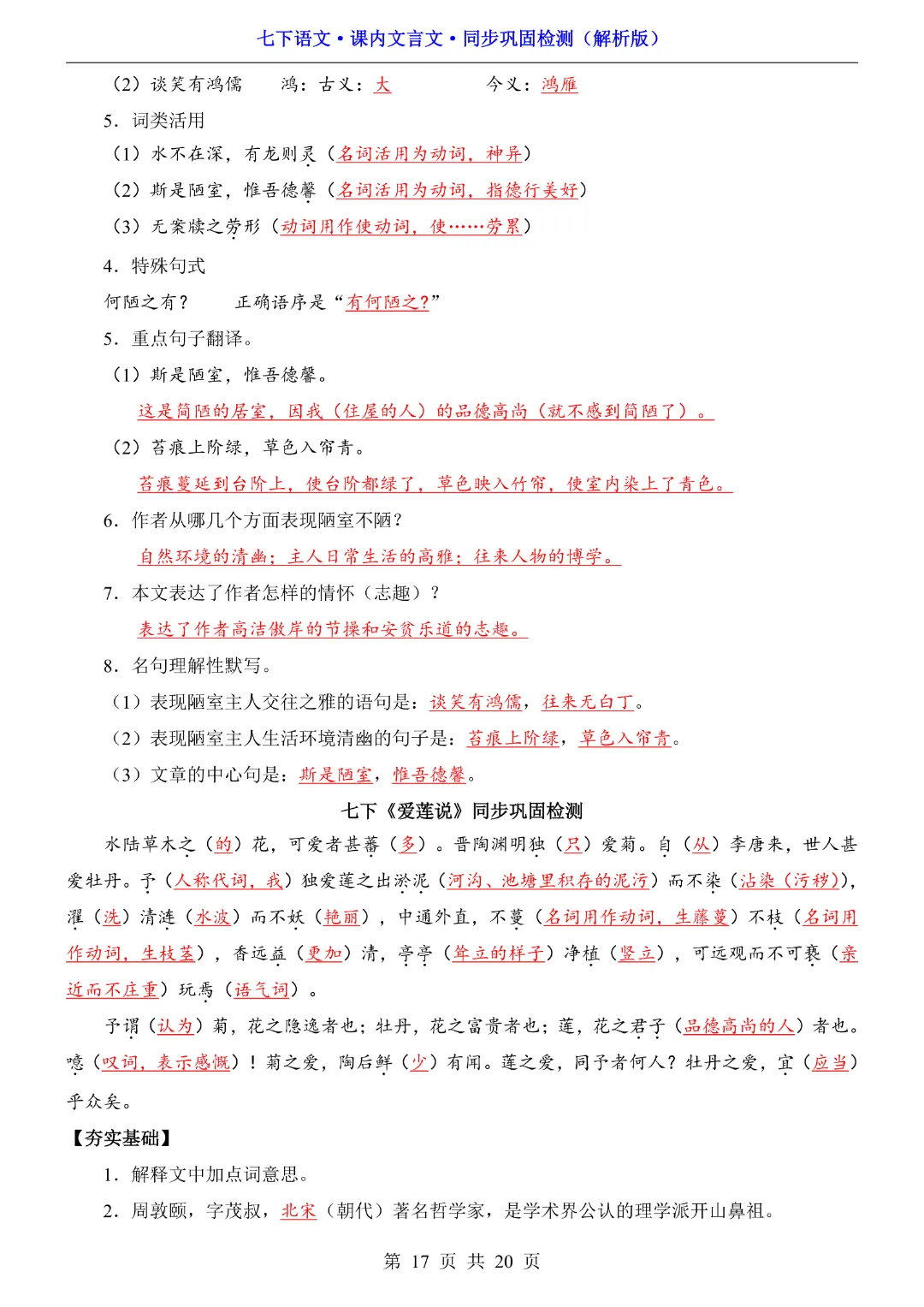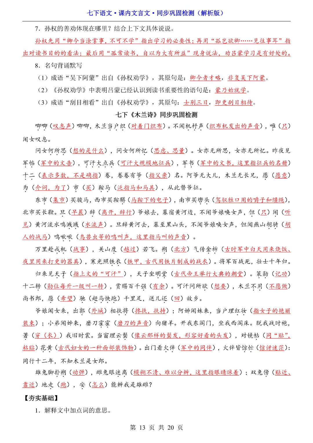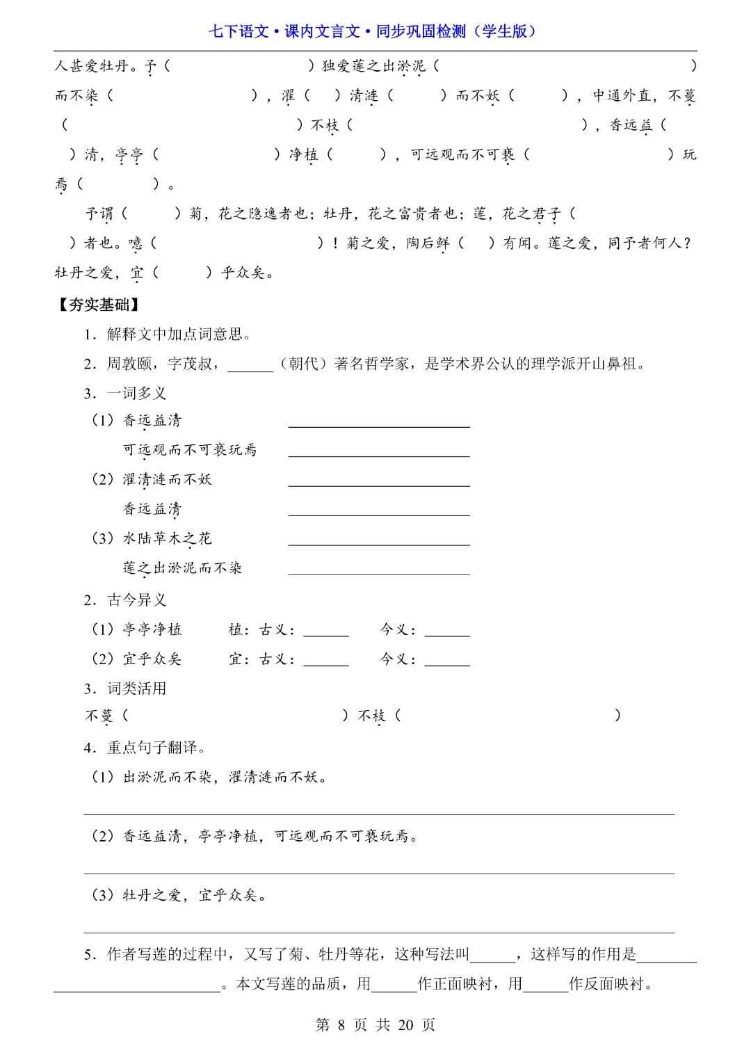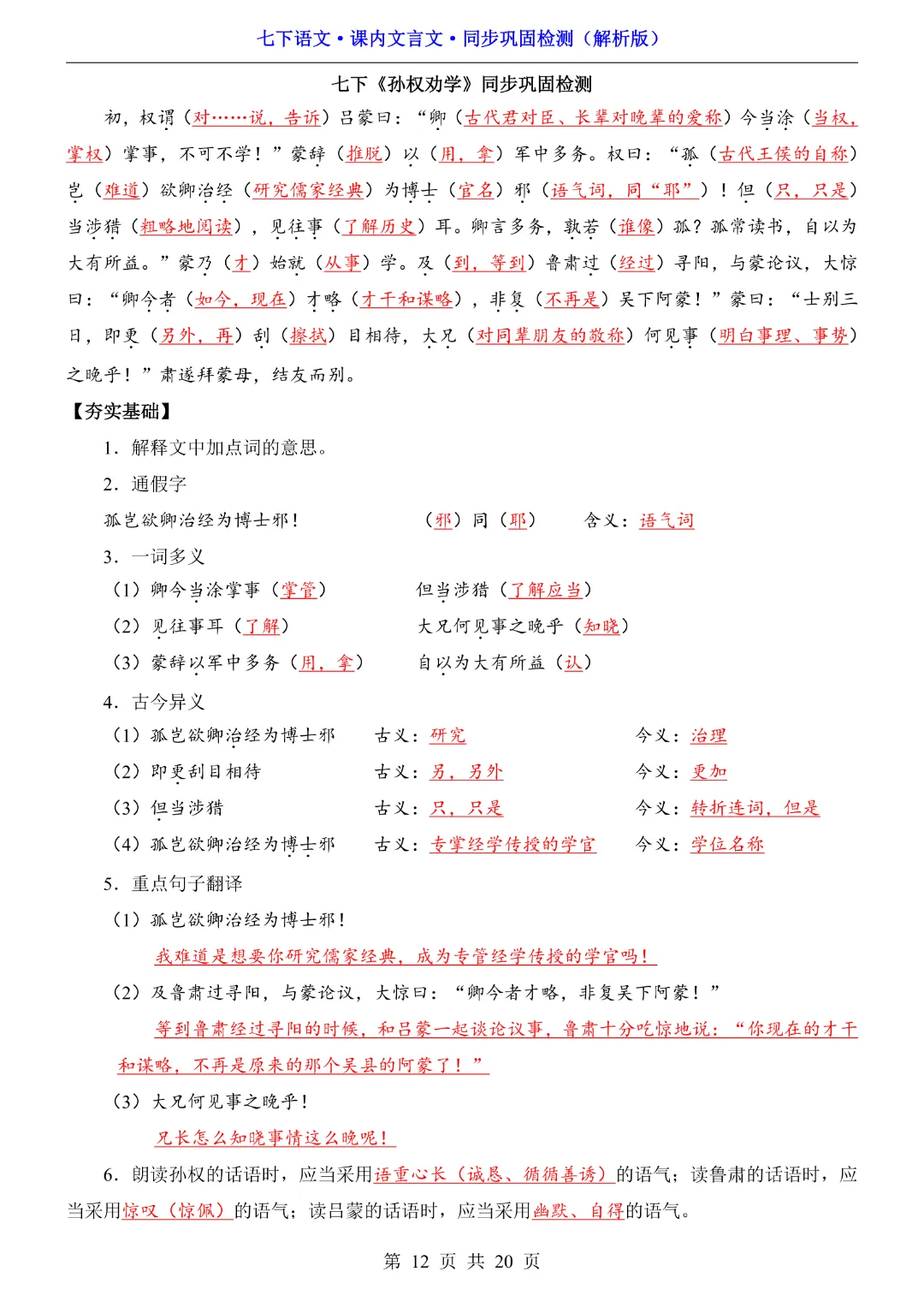 今天给大家分享的是:【七年级下册语文】【统编版】课内文言文同步巩固检测卷带答案|完整高清电子版可打印