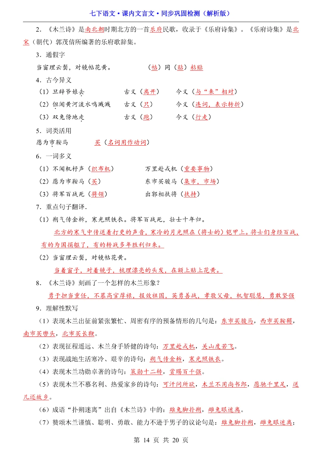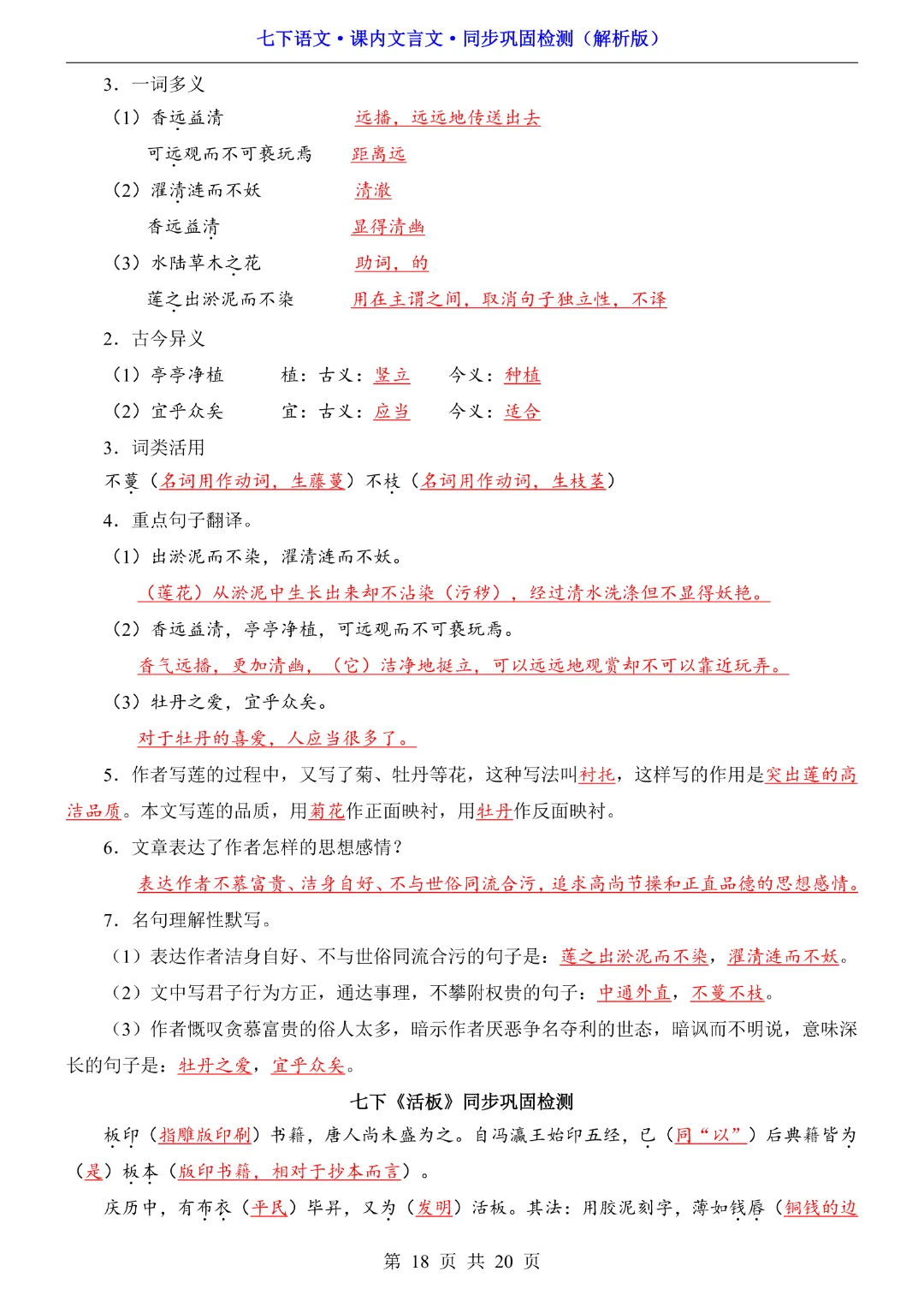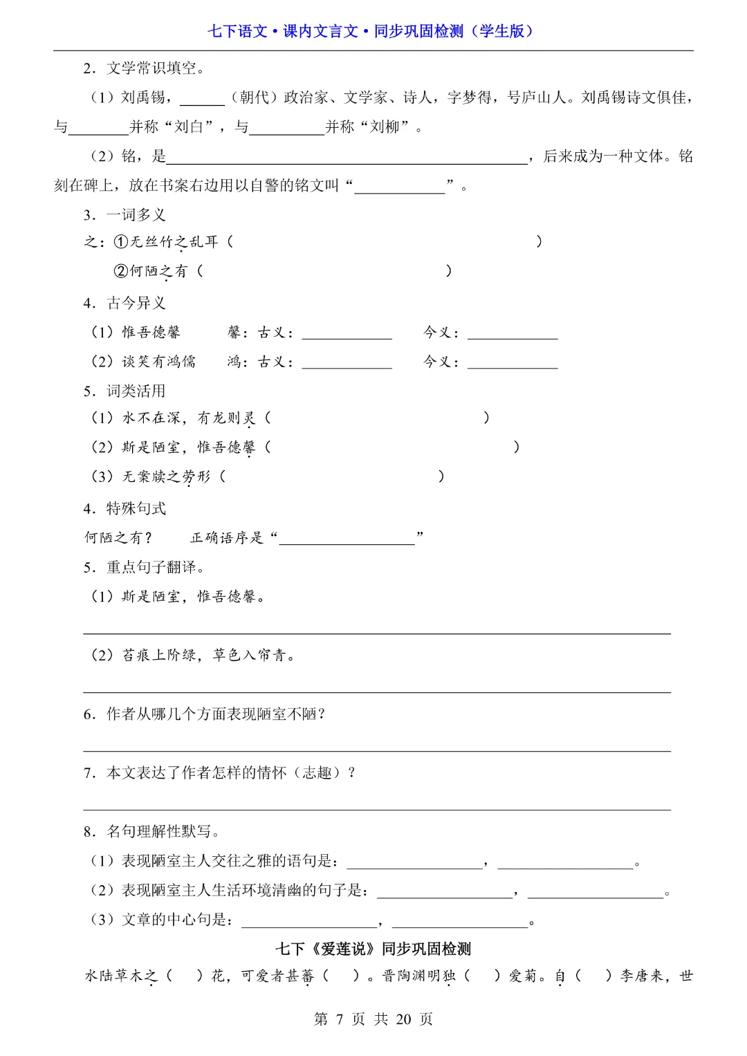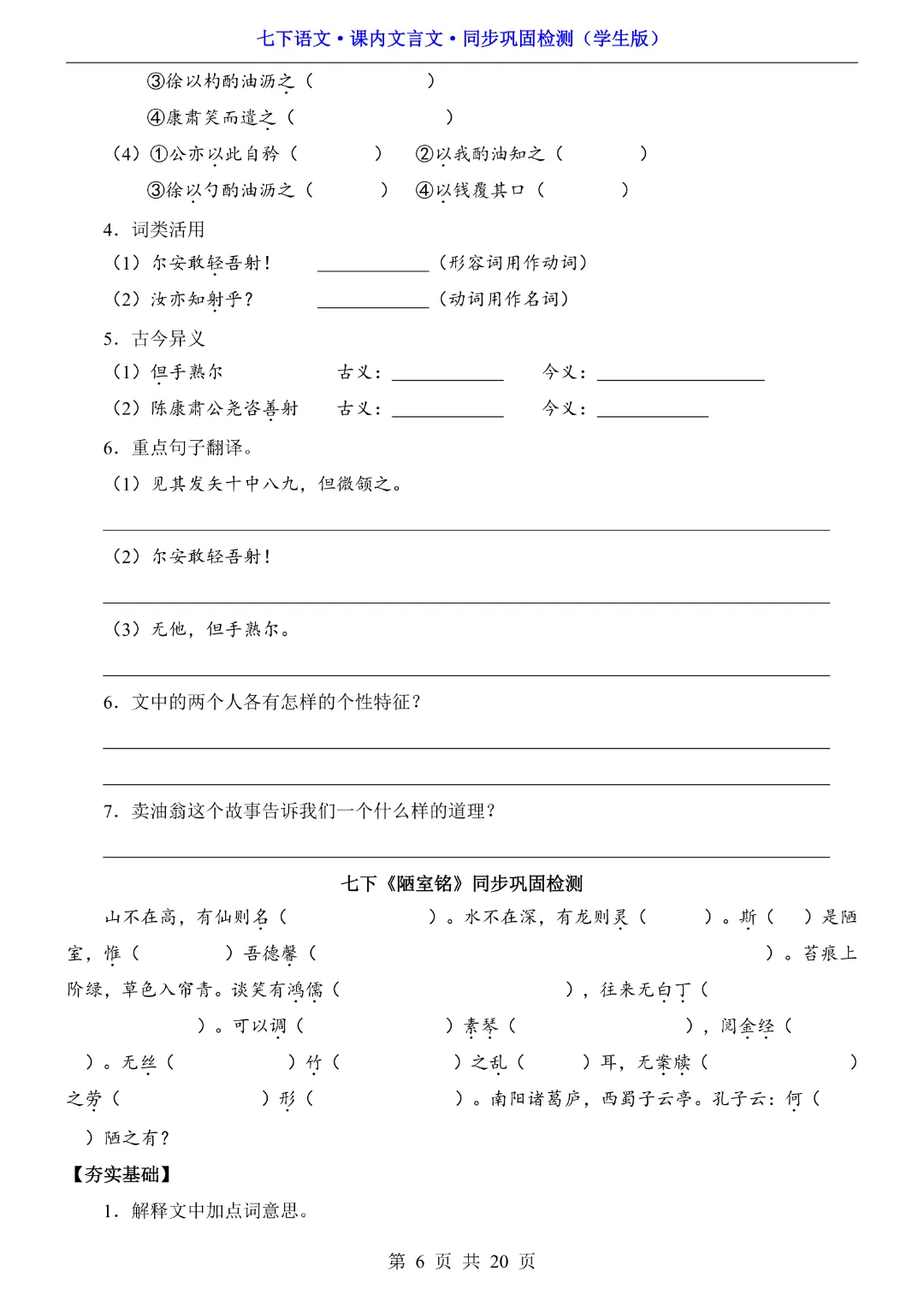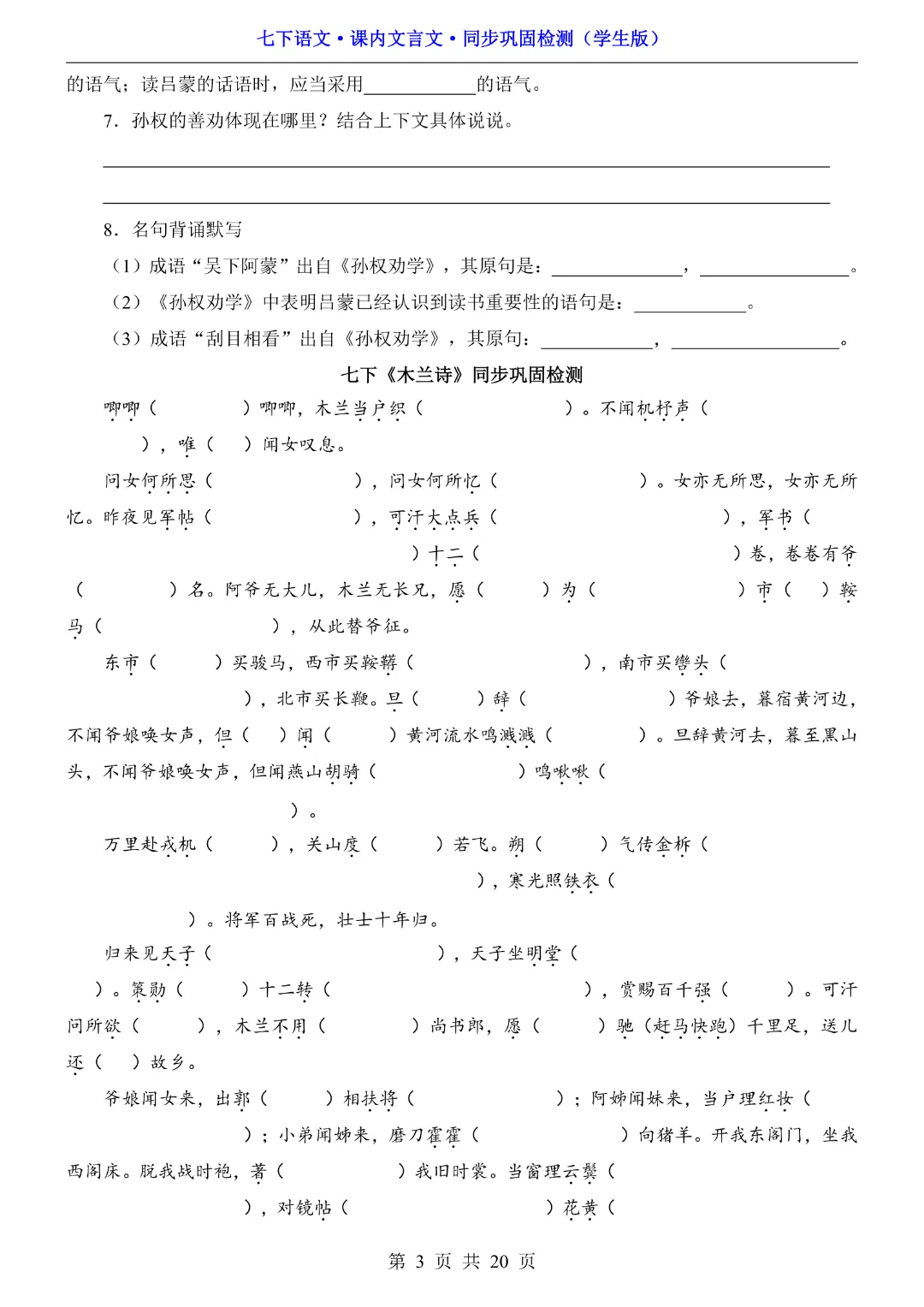 今天给大家分享的是:【七年级下册语文】【统编版】课内文言文同步巩固检测卷带答案|完整高清电子版可打印