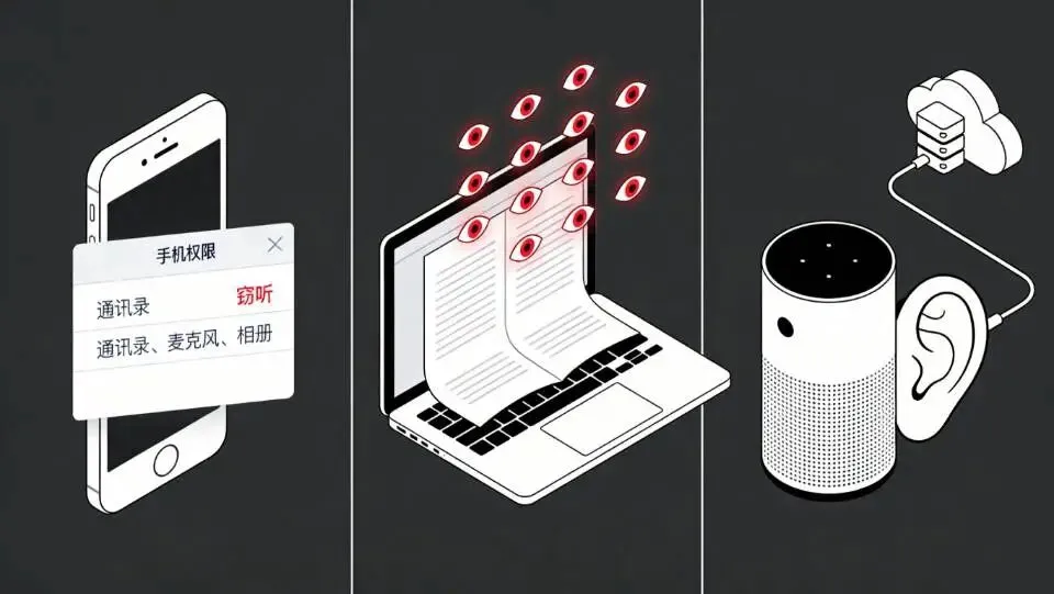 第三类:带AI功能的智能硬件。家里装个智能音箱,卧室放个AI摄像头,车上配个AI助手。这些东西24小时在线,麦克风一直开着,哪天你说了句“最近手头紧”,第二天就给你推网贷广告。