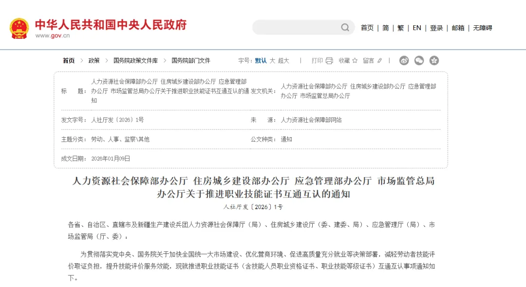 人力资源社会保障部办公厅 住房城乡建设部办公厅 应急管理部办公厅 市场监管总局办公厅关于推进职业技能证书互通互认的通知人社厅发〔2026〕1号