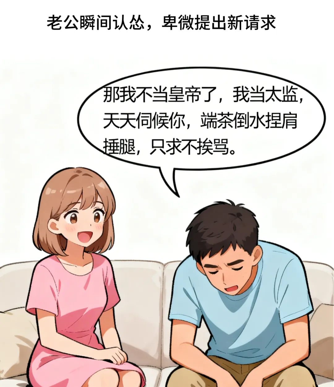 老公秒怂:“那我不当皇帝了,我当太监,天天伺候你,端茶倒水捏肩捶腿,只求不挨骂。”
