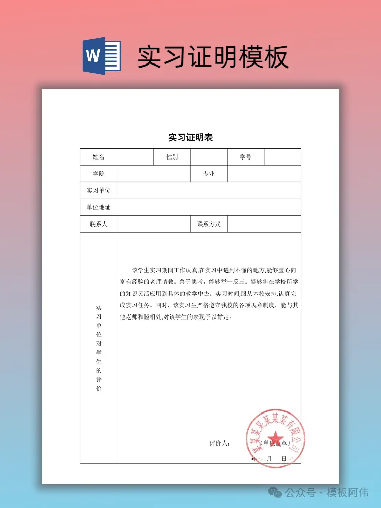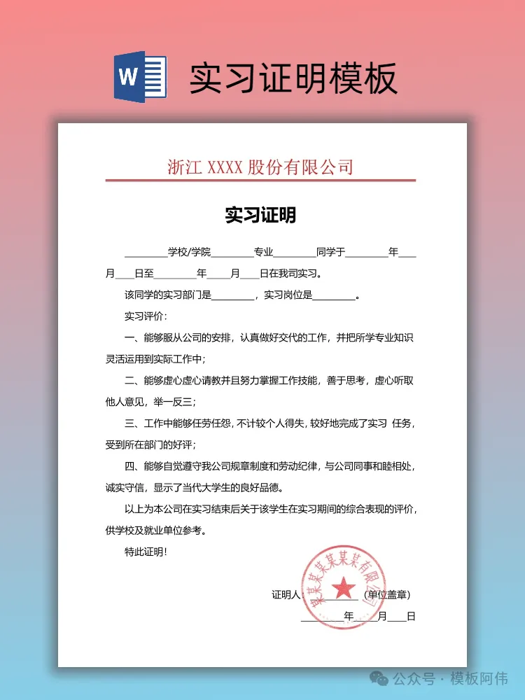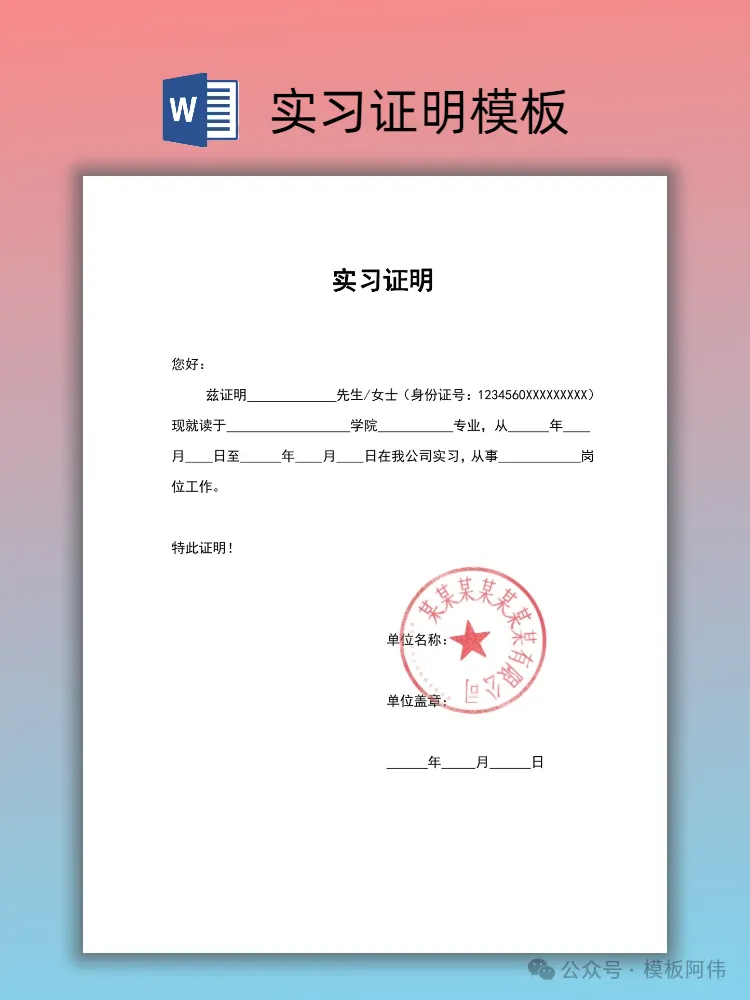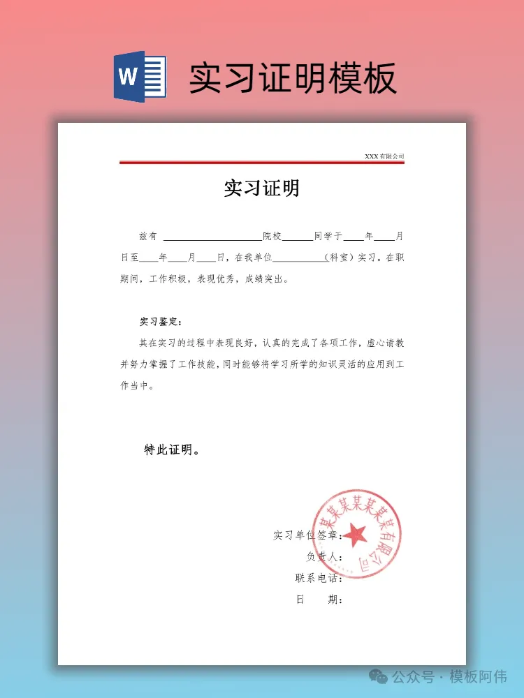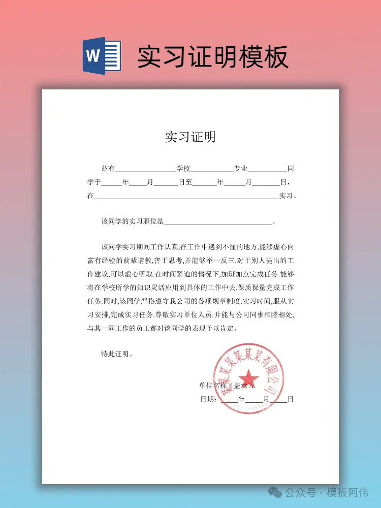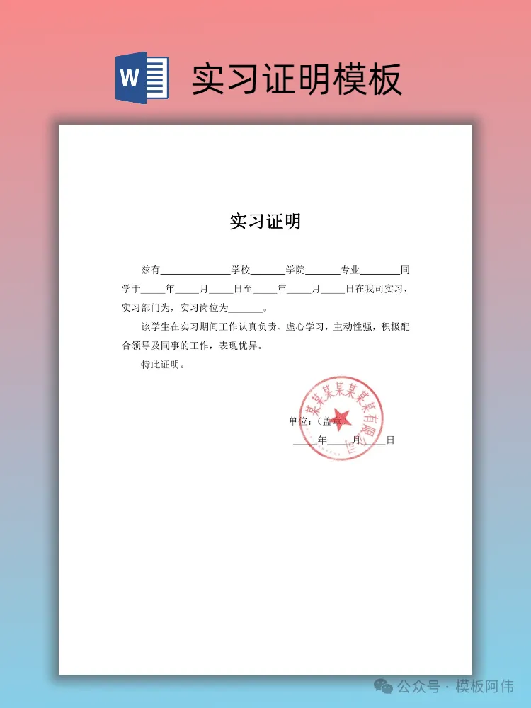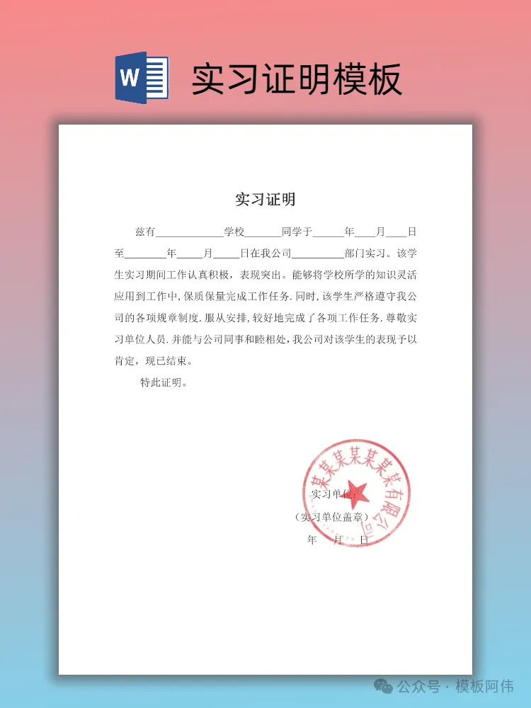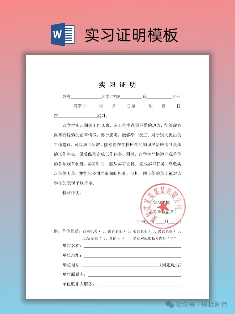 【2026】大学生实习证明模板(word电子版下载) 本文内容分享【实习证明模板】 (文末可领取word电子版) END 电子版领取方式 👇点击下方公众号名片👇 点一点右下角的“赞”和“在看”,感谢! 关注后发送消息“实习证明” 即可领取word电子版 【免责声明】:模板阿伟公众号对转载、分享的内容、陈述、观点判断保持中立,不对所包含内容的准确性、可靠性或完善性提供任何明示或暗示的保证,仅供读者参考,并请承担全部责任! 【版权声明】:图文以及模板来源于网络,版权归原作者所有,仅供学习参考,禁止用于商业用途,如有异议,请留言联系本公众号删除。 #实习证明 #实习证明模板 #大学生实习证明 #大学生实习 #实习 #实习证明模板word #应届生