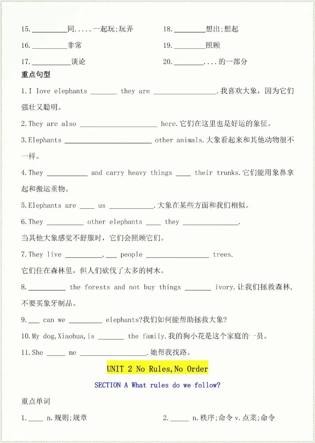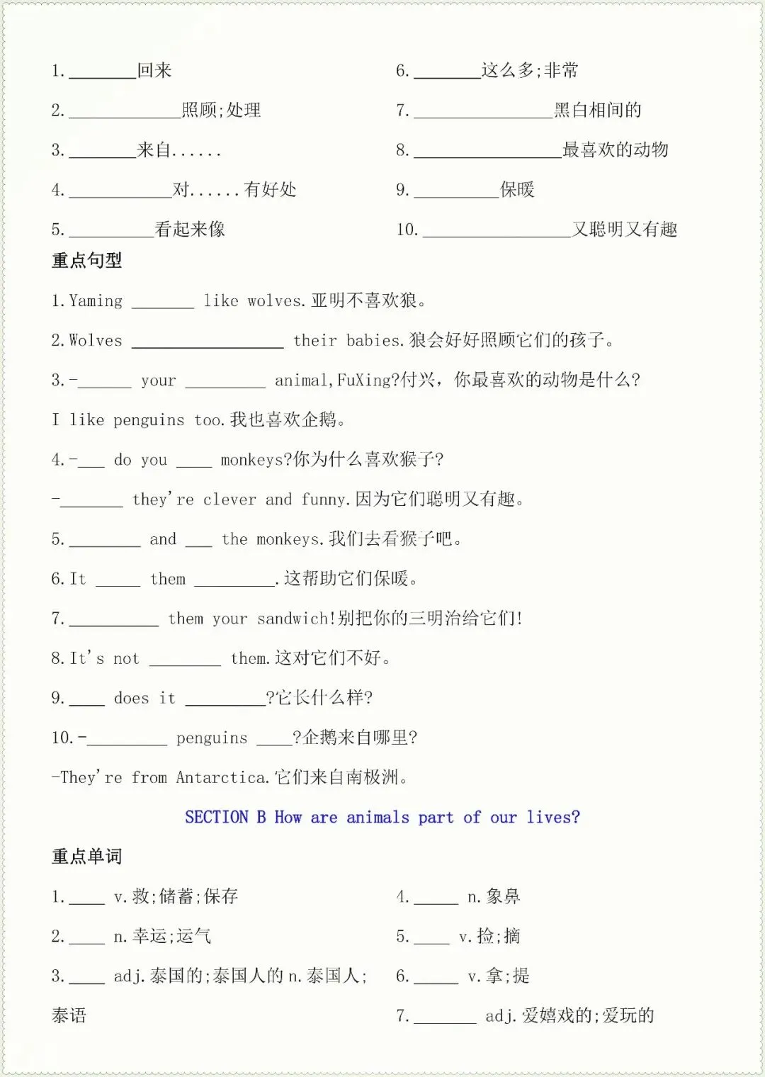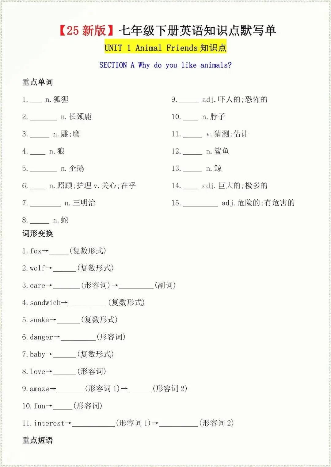 七年级下册英语核心知识点默写单总(电子版可打印)