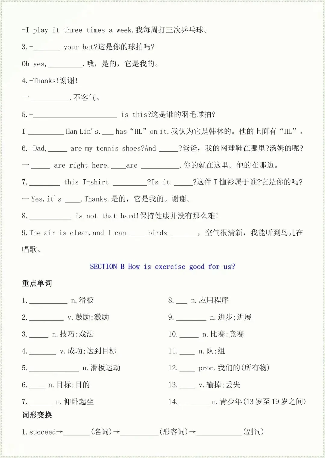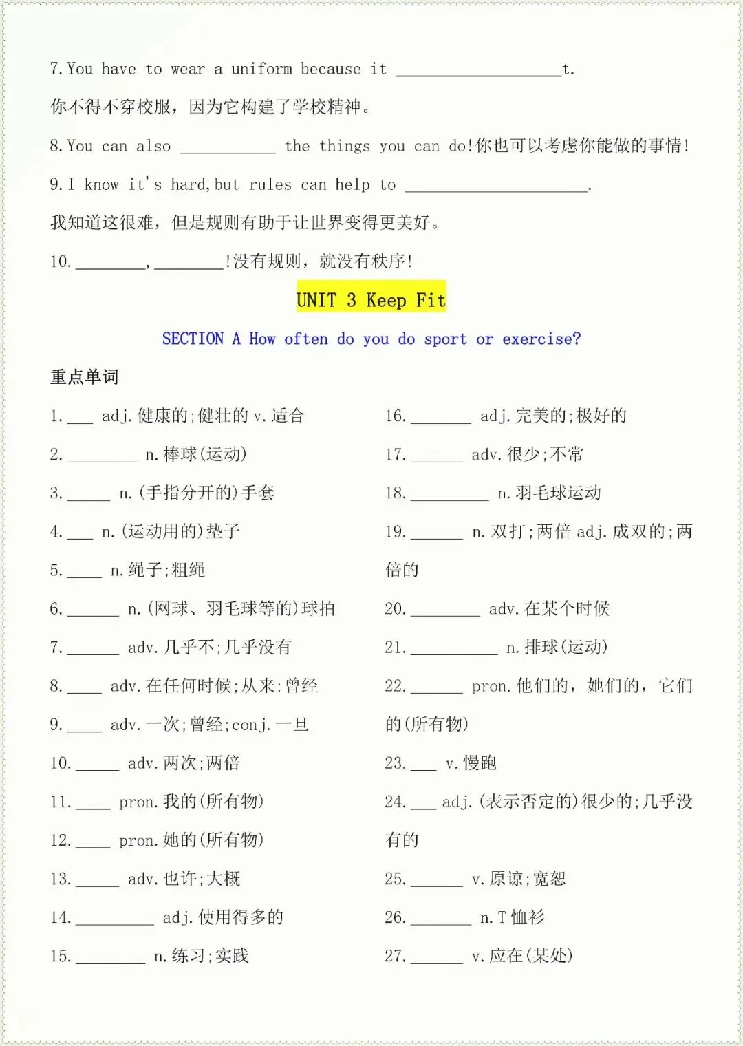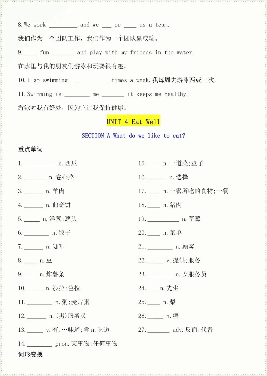 七年级下册英语核心知识点默写单总(电子版可打印)
