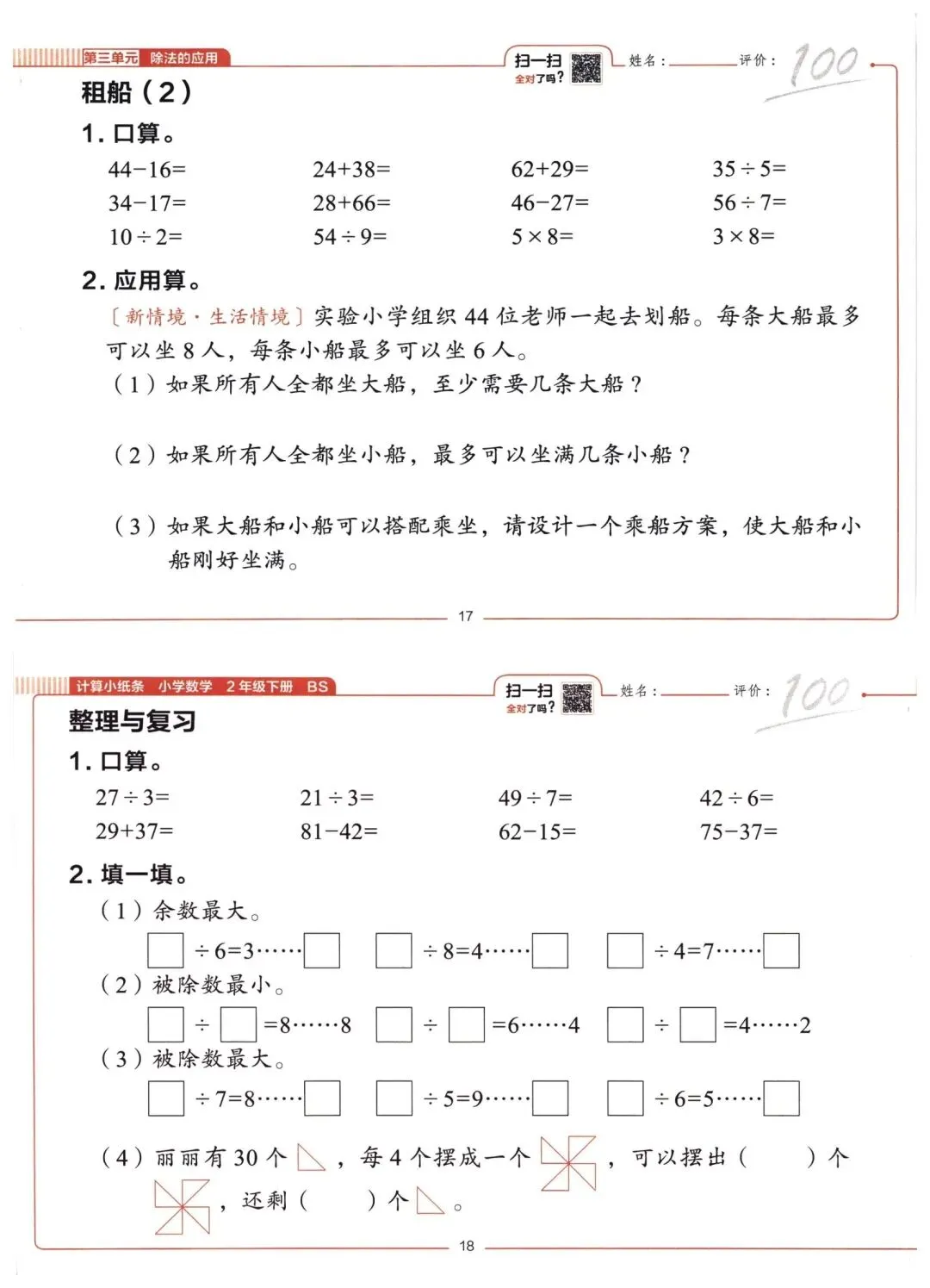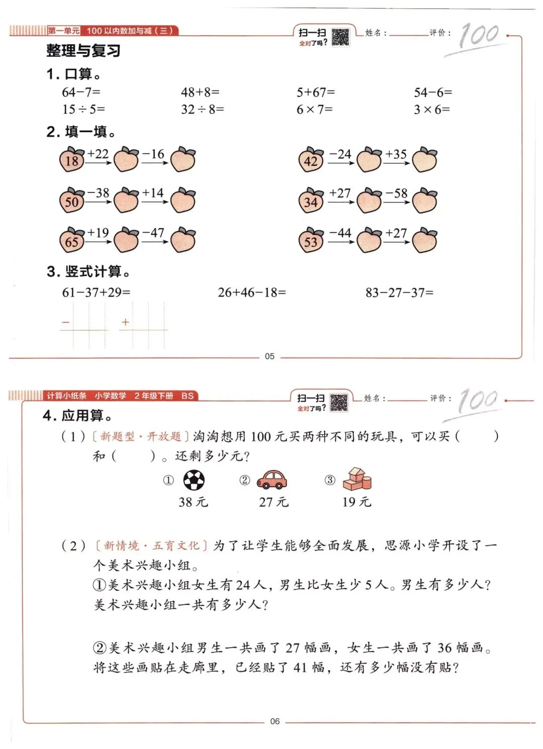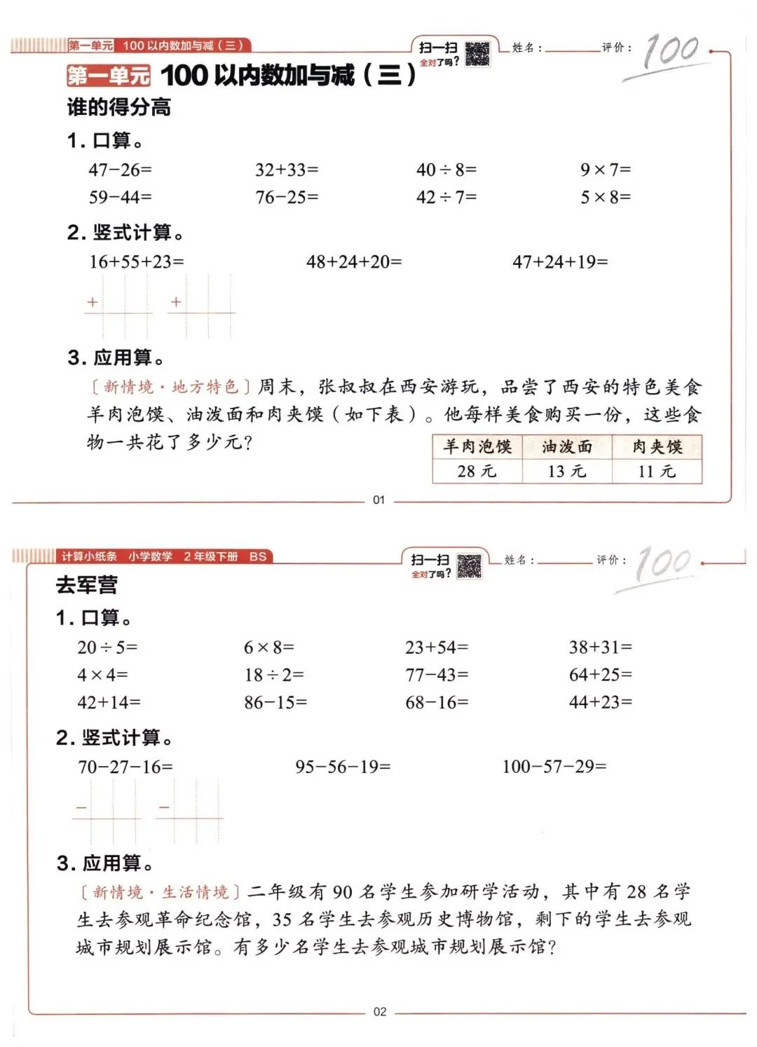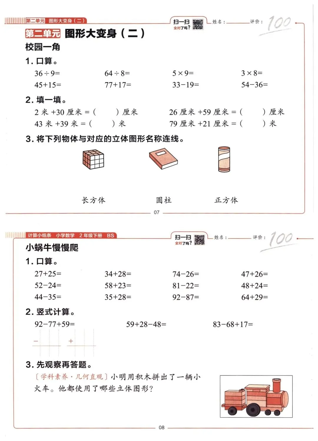 26春二年级下册数学北师大版同步课本一课一练计算小纸条(电子版可打印)