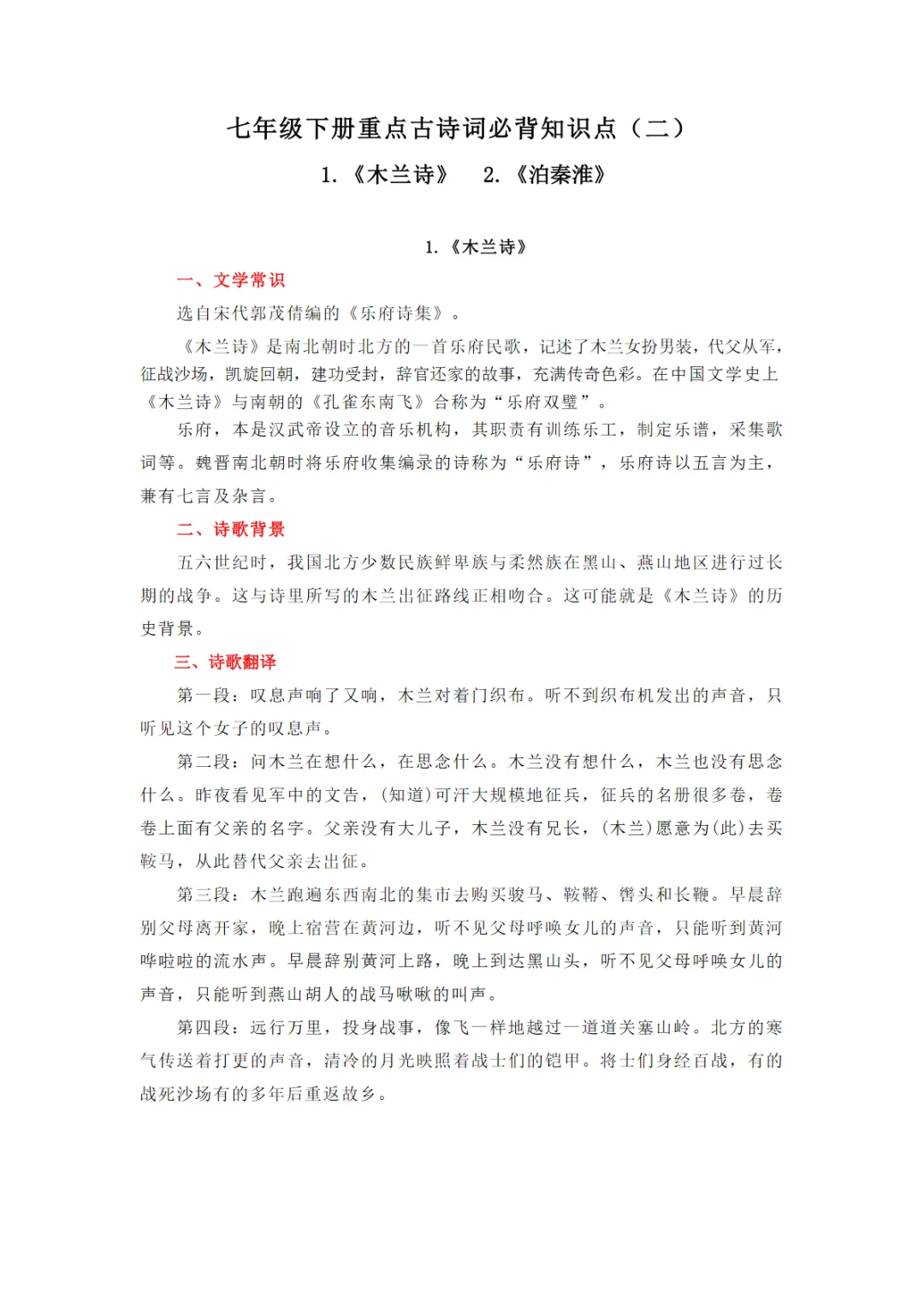 【免费下载】七年级(下)语文 重点古诗词必背知识点(二),PDF电子版,可打印,共5页