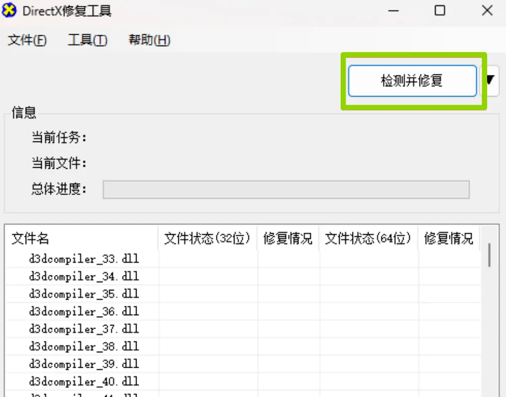 2.点击检测并修复,程序会自动扫描并修复系统缺失的 dll 文件与 C++ 运行库异常。