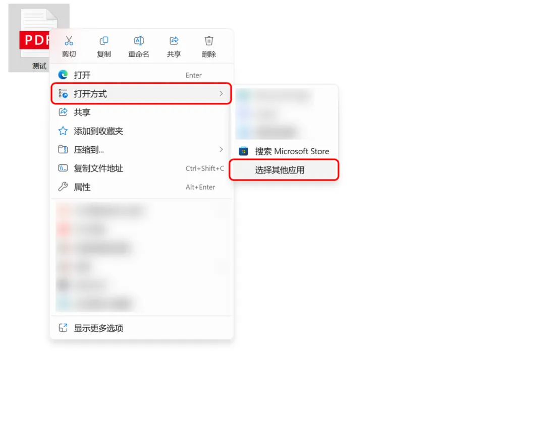 首先,右击想要压缩的PDF文件,选择【打开方式】点击【选择其他应用】,选择【Word】并点击【仅一次】。