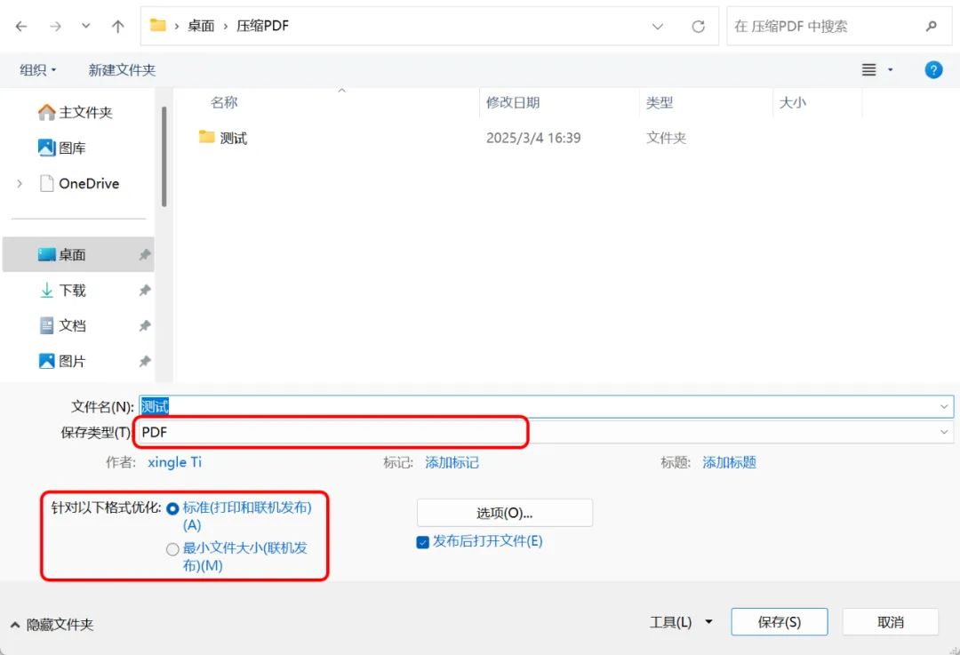 等待文件打开后,点击左上角【文件】,选择【另存为】–【浏览】确认想要存储的位置,保存类型选择【PDF】。到这一步,注意左下角的【标准】与【最小文件大小】。