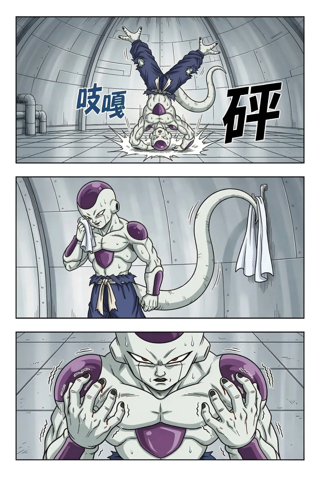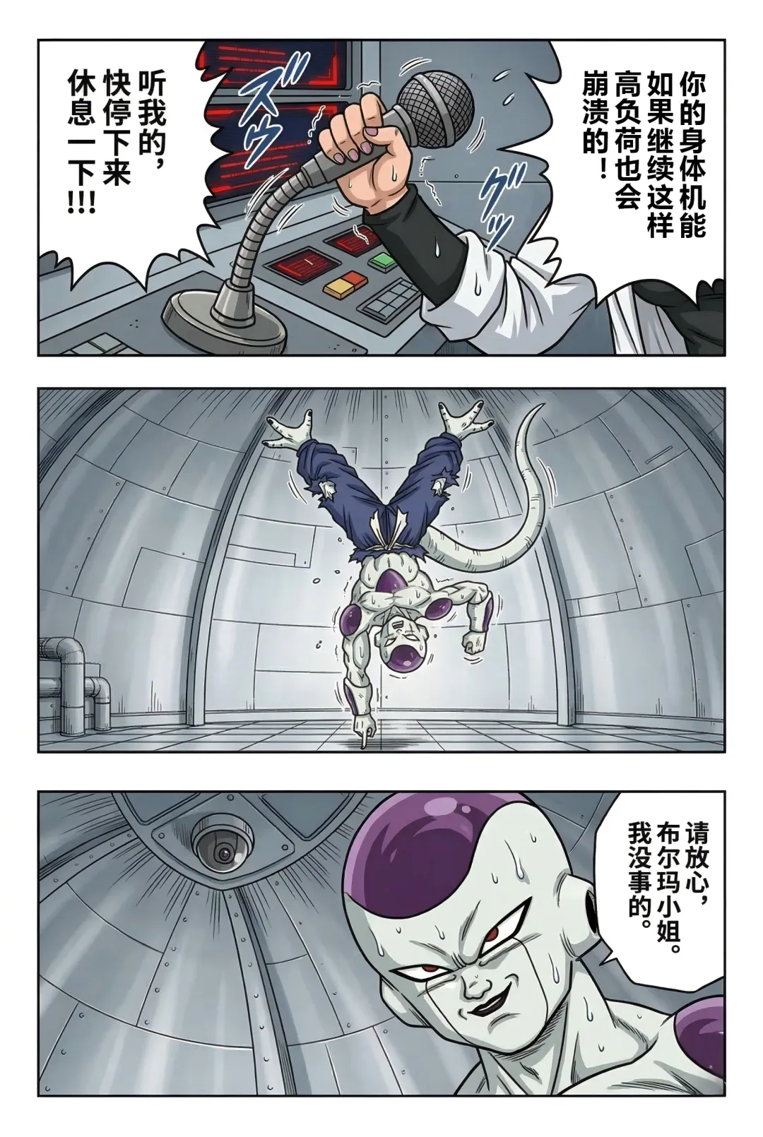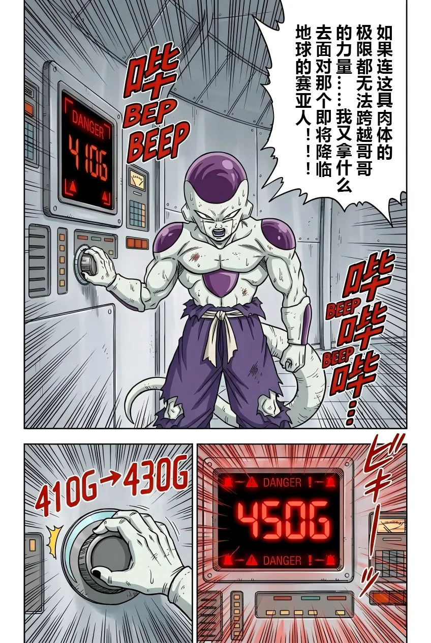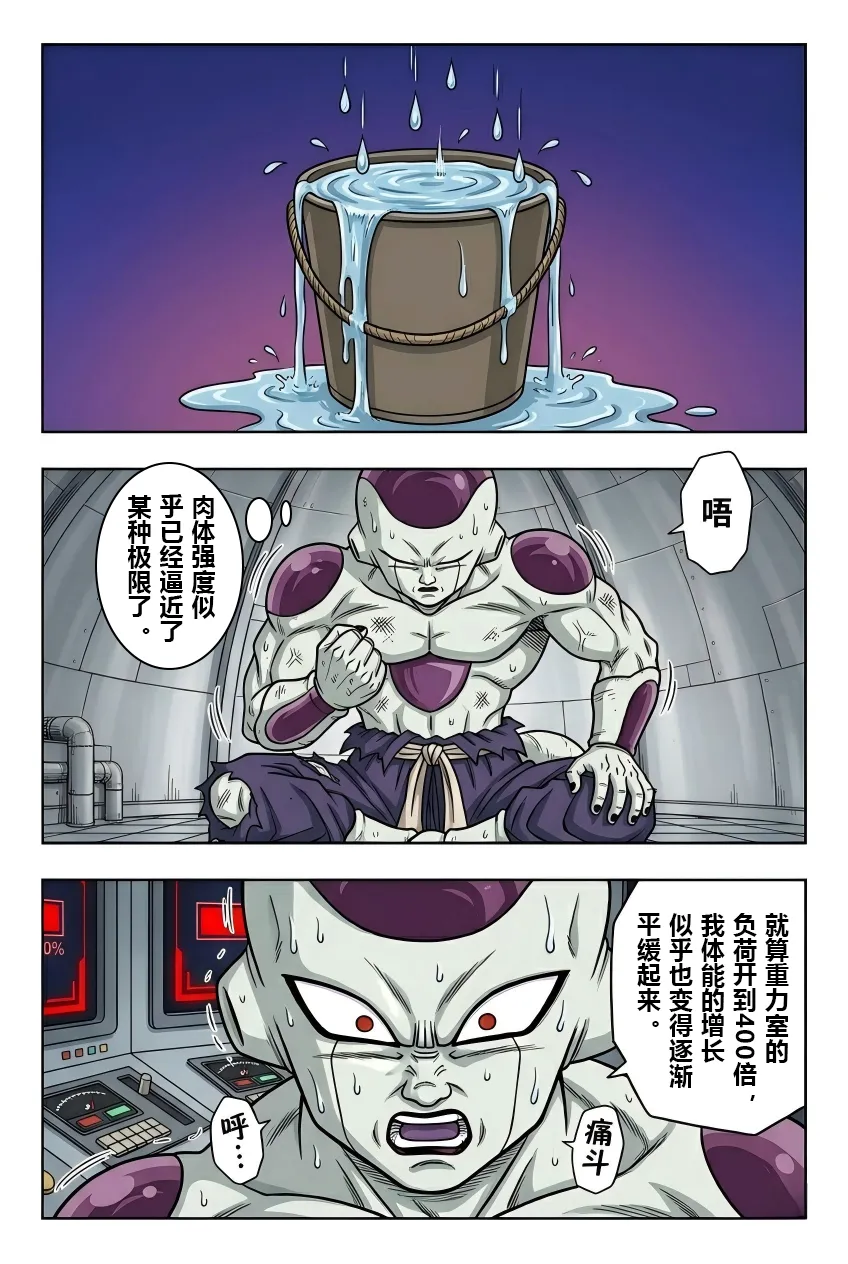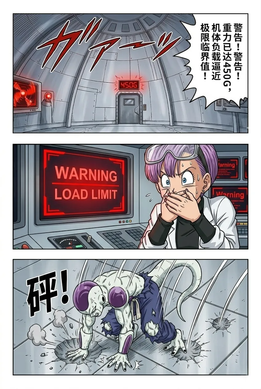 《龙珠F》漫画:第55话!弗利萨的极限试炼! 古拉离开后的第五天,弗利萨正在挑战400倍地球重力的肉体极限。负责监测的布尔玛看到系统显示“身体负荷100%”且设备即将损毁,焦急地通过麦克风劝阻,担心他会命丧于此。 然而,一向狂傲的弗利萨在此时表现出了惊人的礼貌与执着。他不仅安抚布尔玛不要担心,甚至还为自己意外损坏了特种合金地板表示歉意,并承诺在击败宿敌后会通过打工来偿还修理费。他之所以如此拼命,是因为心中一直铭记着哥哥古拉对他的嘲讽——称他为“没有开刃的废刀”。 为了在未来能击败赛亚人和古拉,弗利萨意识到必须不断磨炼这具肉体。当他感觉到400倍重力下的提升速度变慢时,他不顾身体已经出现的痉挛和咯血,强行将重力推升至450倍的临界值。在重力室报警声大作、身体几乎要崩溃的最后一刻,弗利萨凭借顽强的意志站稳脚跟,亲手按下了停止键。