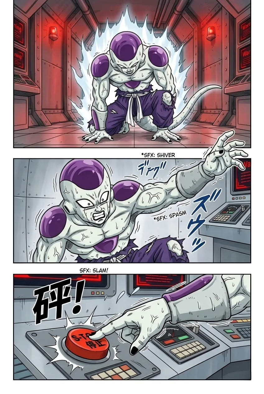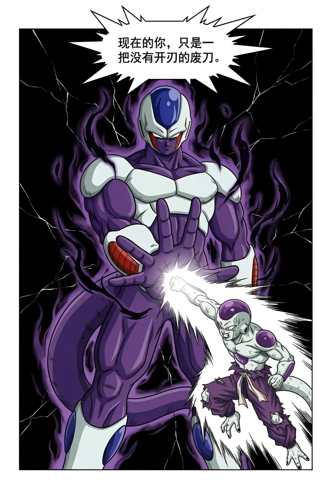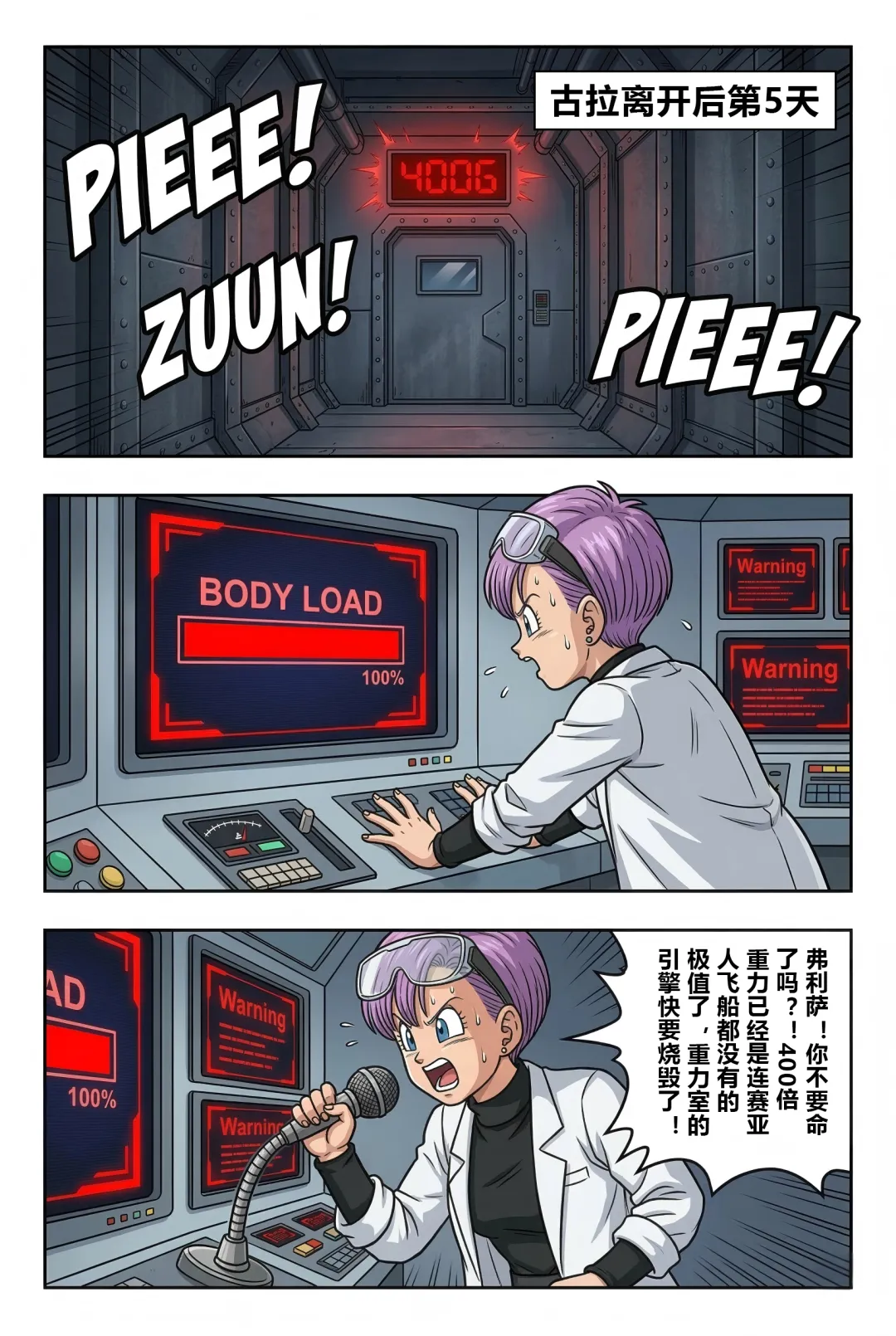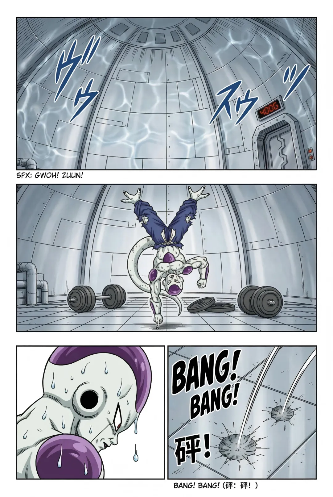 《龙珠F》漫画:第55话!弗利萨的极限试炼! 古拉离开后的第五天,弗利萨正在挑战400倍地球重力的肉体极限。负责监测的布尔玛看到系统显示“身体负荷100%”且设备即将损毁,焦急地通过麦克风劝阻,担心他会命丧于此。 然而,一向狂傲的弗利萨在此时表现出了惊人的礼貌与执着。他不仅安抚布尔玛不要担心,甚至还为自己意外损坏了特种合金地板表示歉意,并承诺在击败宿敌后会通过打工来偿还修理费。他之所以如此拼命,是因为心中一直铭记着哥哥古拉对他的嘲讽——称他为“没有开刃的废刀”。 为了在未来能击败赛亚人和古拉,弗利萨意识到必须不断磨炼这具肉体。当他感觉到400倍重力下的提升速度变慢时,他不顾身体已经出现的痉挛和咯血,强行将重力推升至450倍的临界值。在重力室报警声大作、身体几乎要崩溃的最后一刻,弗利萨凭借顽强的意志站稳脚跟,亲手按下了停止键。
