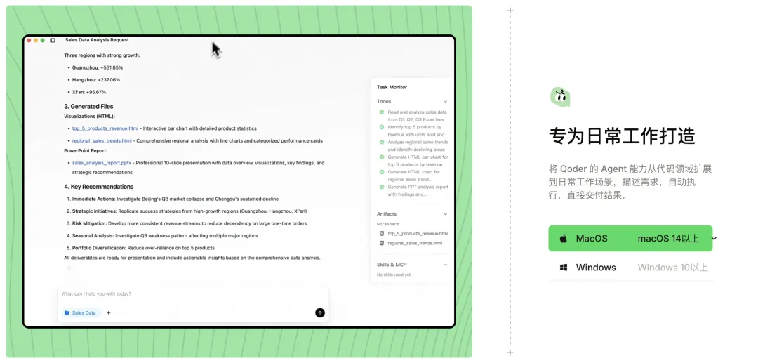 QoderWork支持自动清洗Excel/CSV数据,生成可视化图表,一键输出可编辑的分析报告或PPT。采访录音、会议纪要可快速转化为公众号长文、小红书笔记、视频脚本及字幕文件。