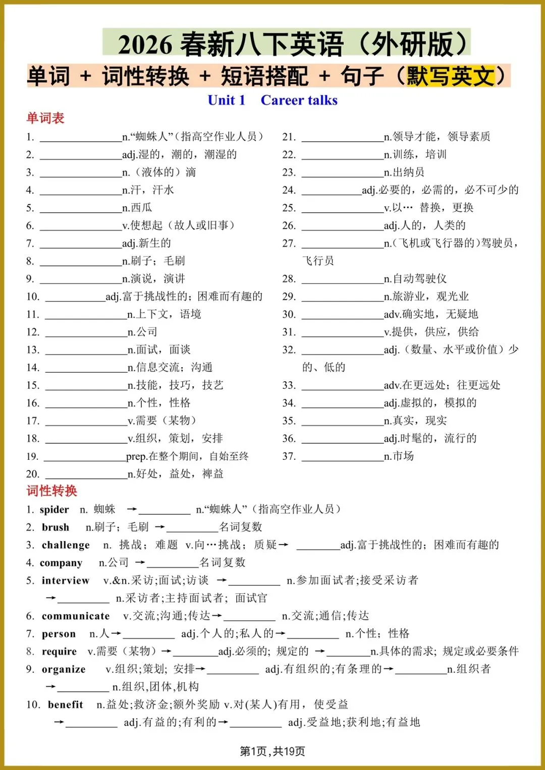 今日精心为您整理了: 2026春新外研版八年级下册《英语》 全册重点单词+词性转换+短语搭配+句子 (默写英文)电子完整版可打印!