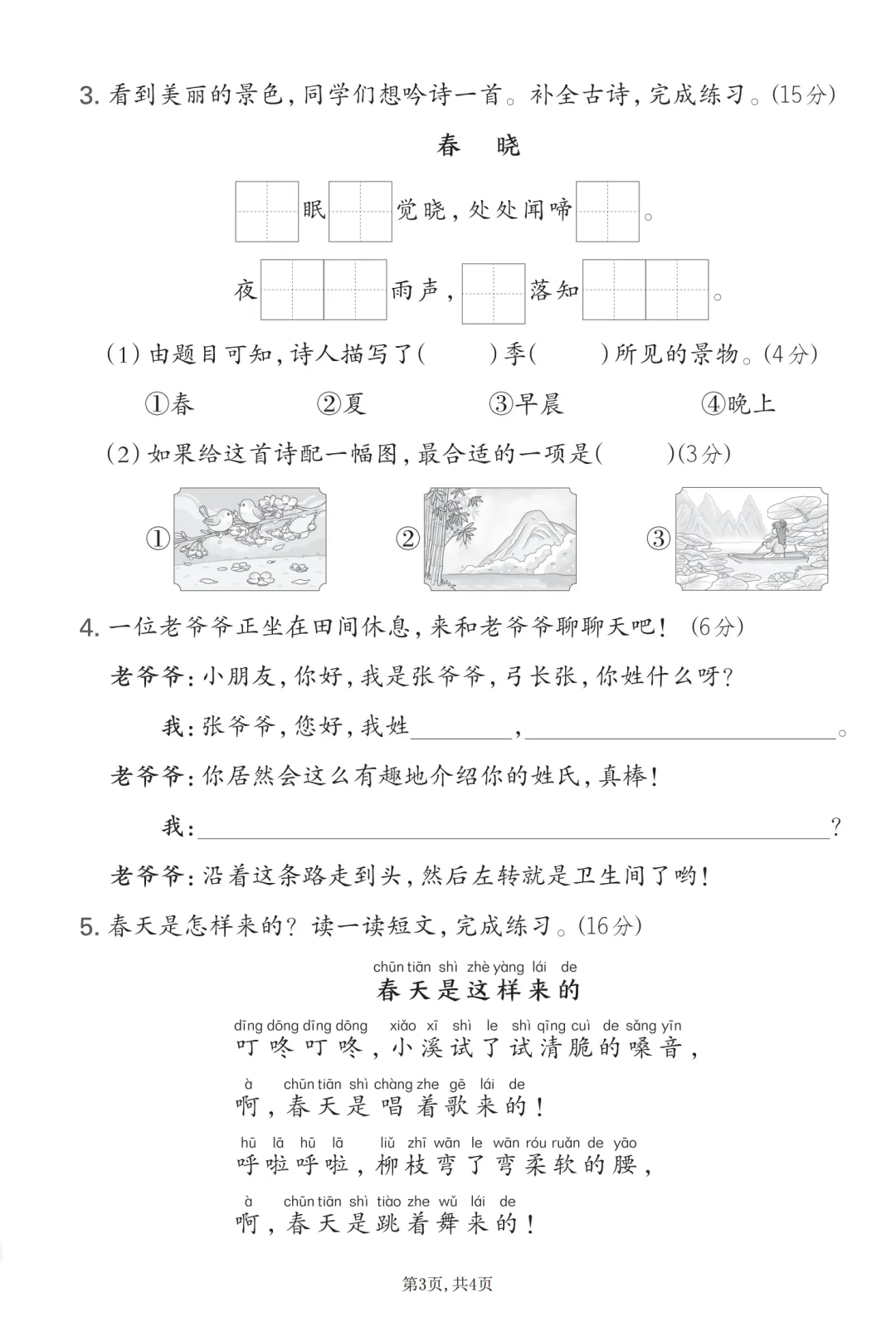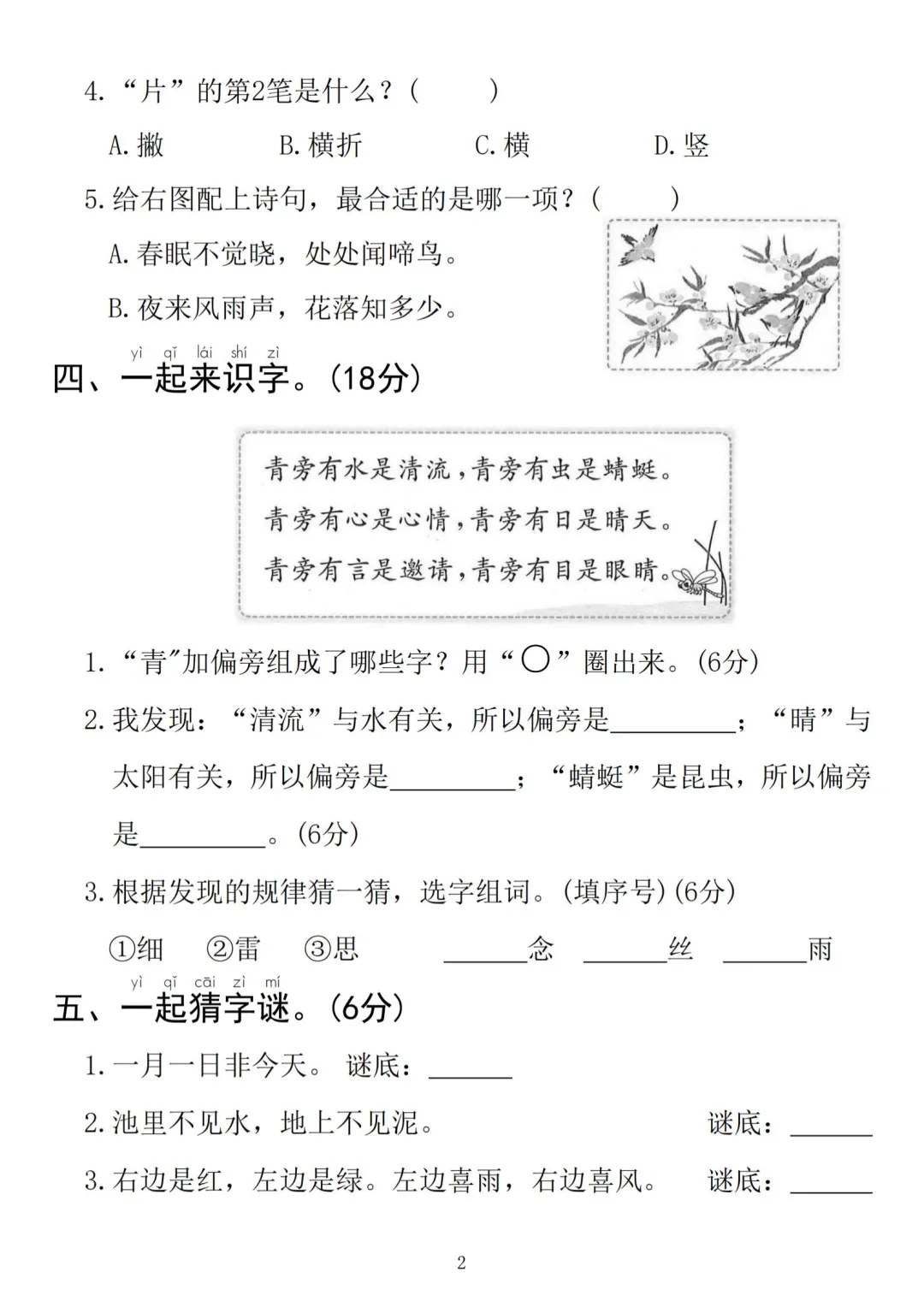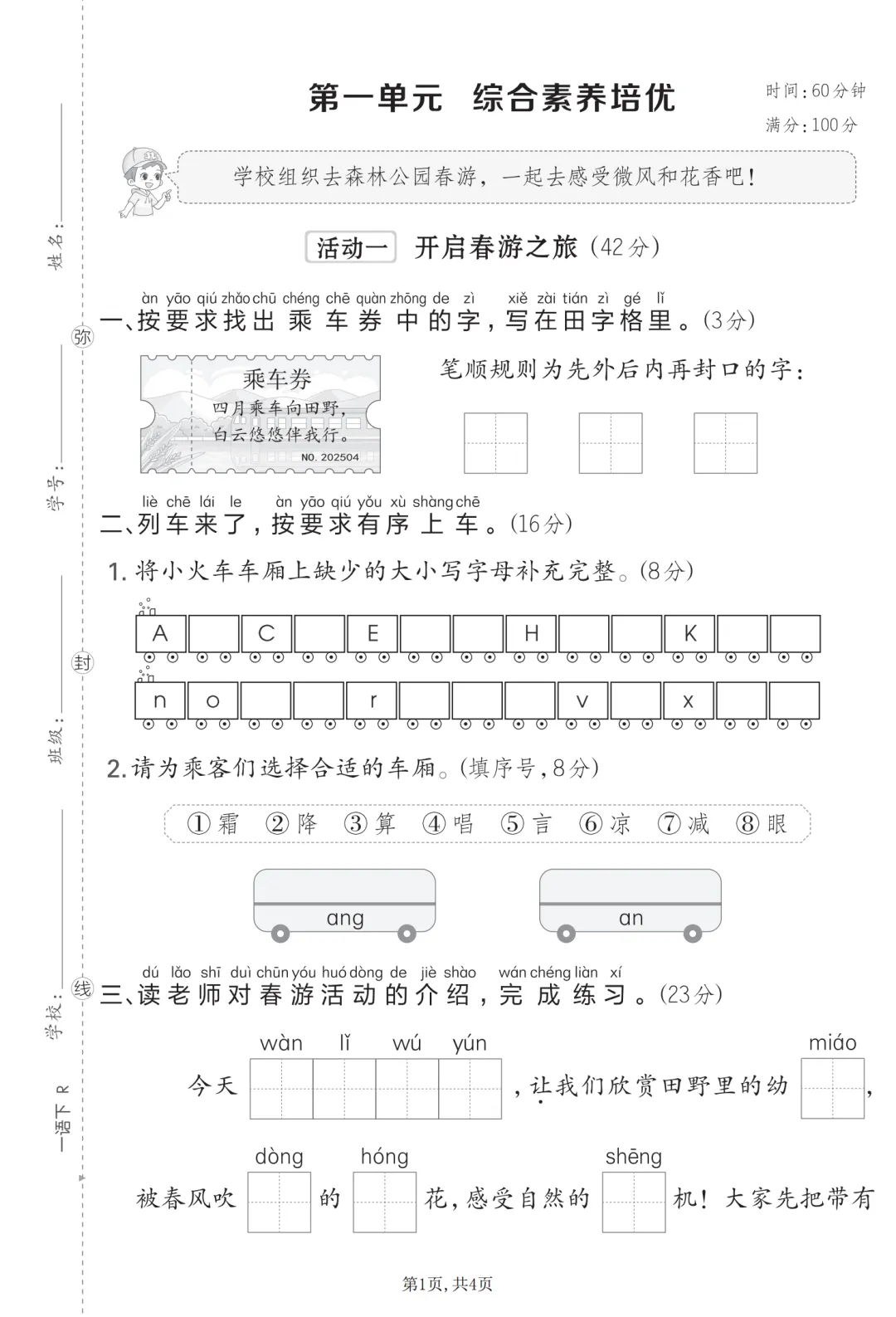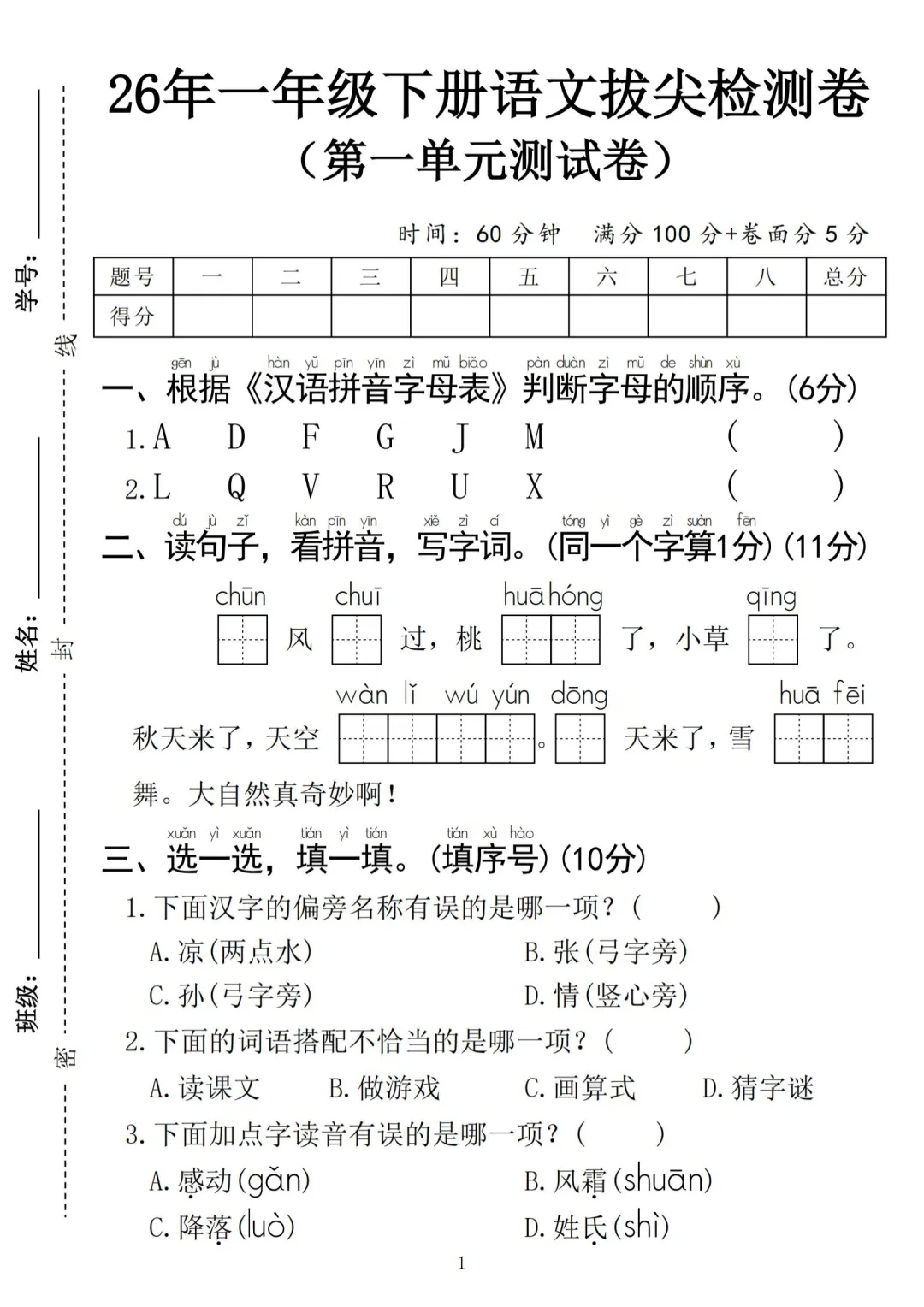 26年部编版一年级下册语文《第一单元测试卷》(共5套,有答案)可打印