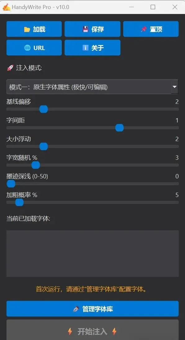使用前需要打开Word、WPS、Excel或者ET,然后选择需要手写的文字,再调节基线偏移、字间距、大小浮动、字宽随机等等,设置后点【开始注入】即可。