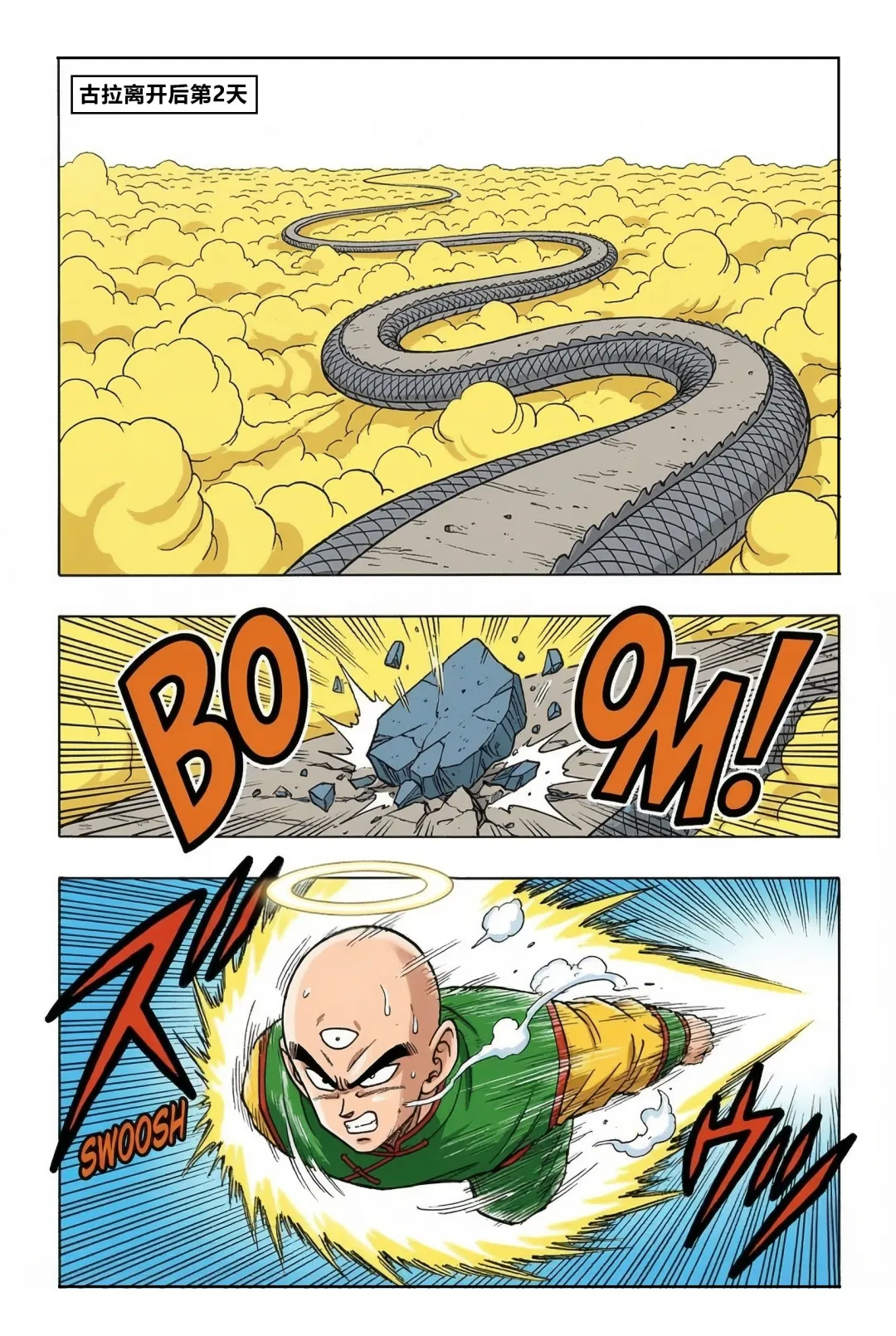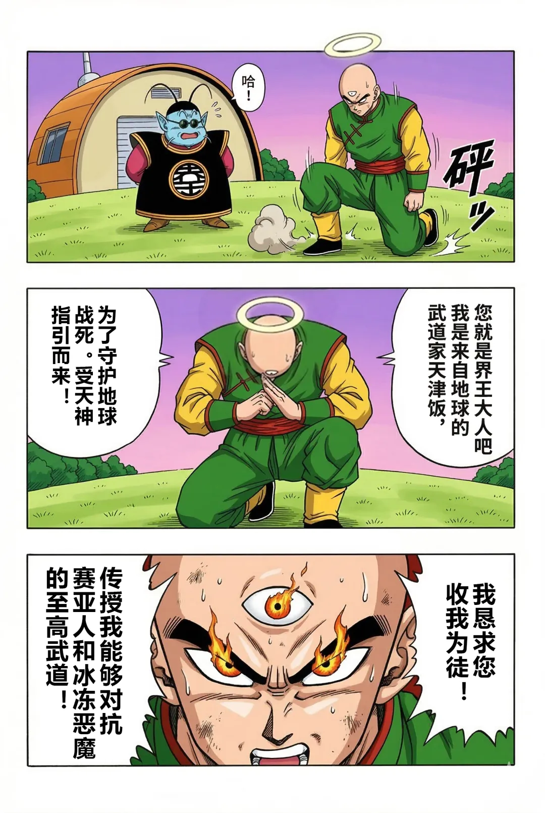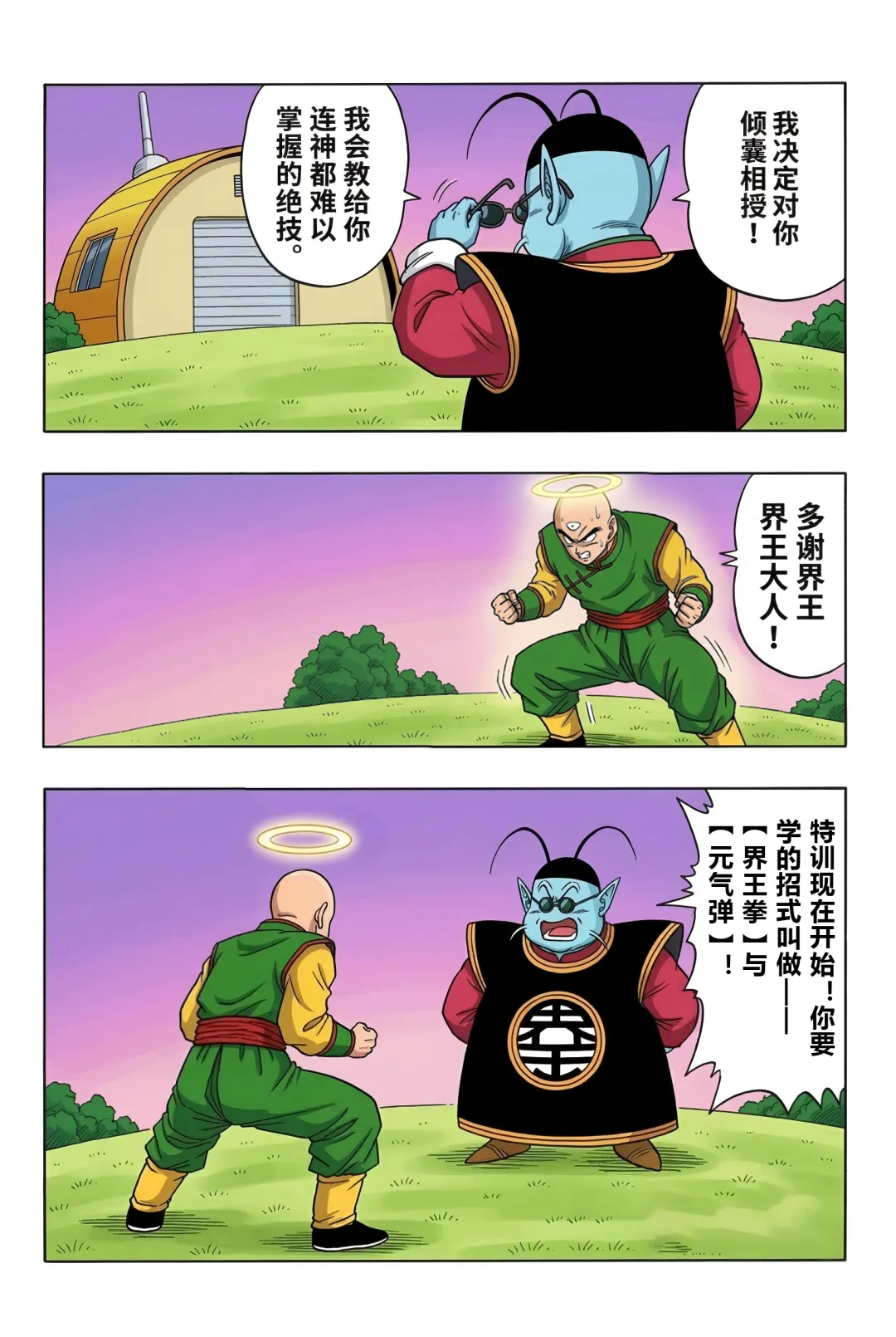 古拉离开后的第二天,已阵亡的地球战士天津饭穿过漫长的蛇道,终于抵达了界王星。他向界王表明身份,恳求界王收他为徒,以获取对抗宇宙恶魔的强大武道。