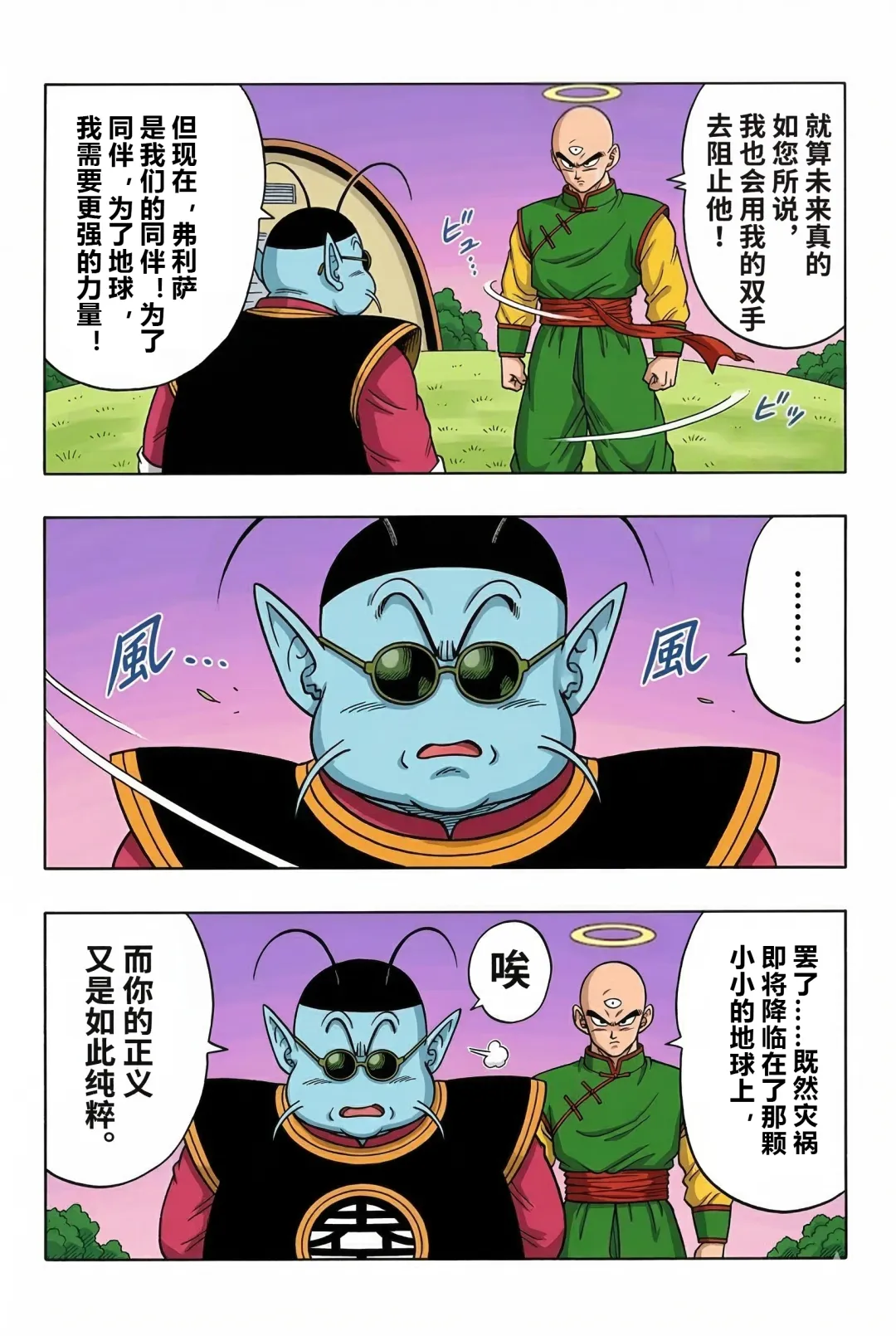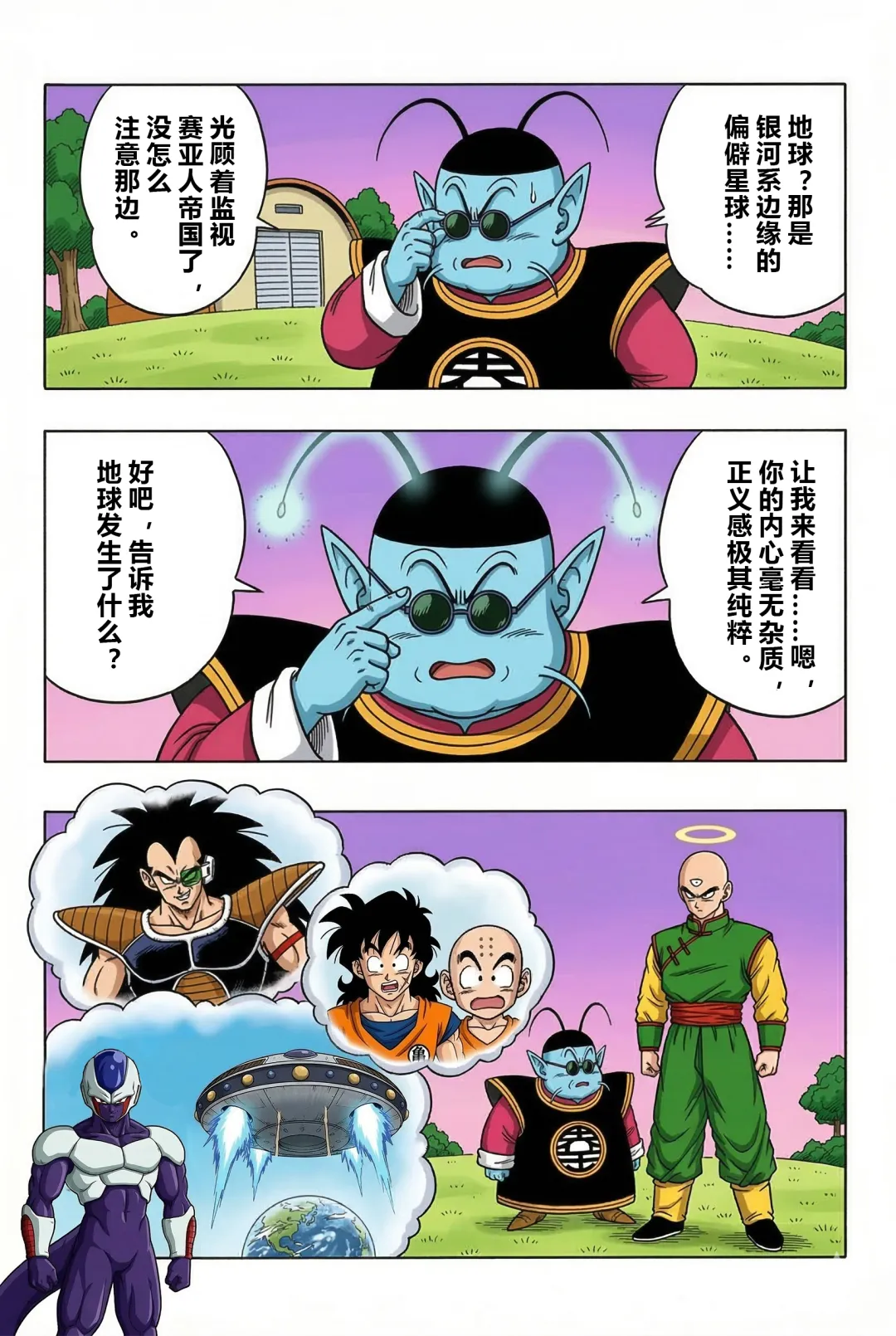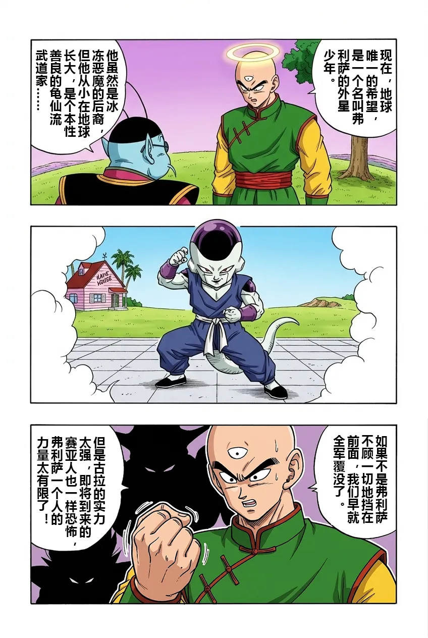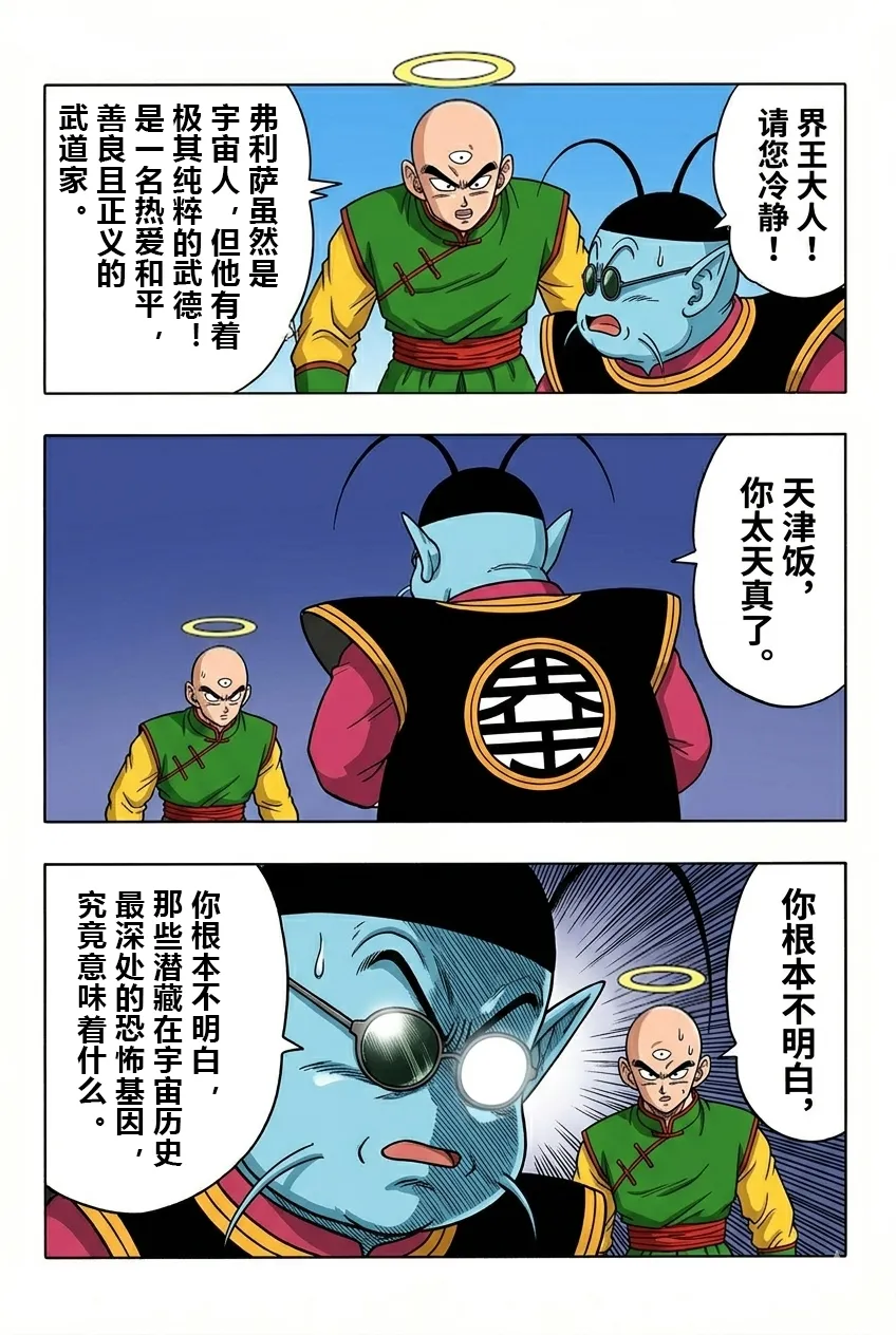 界王探查了天津饭纯粹的内心后,询问地球的现状。天津饭透露,目前地球唯一的希望竟是一个从小在地球长大、本性善良且修习龟仙流的冰冻恶魔少年——弗利萨。听闻这个曾在宇宙中以残暴统治著称的种族竟有遗孤在地球,界王大为震惊。他向天津饭发出严厉警告:赛亚人的嗜血与冰冻恶魔的残暴是深植灵魂的恐怖本能,不可盲目轻信。