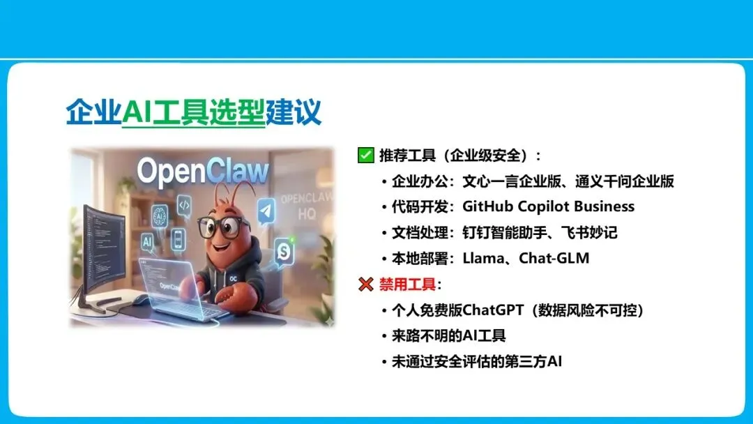 企业AI工具安全使用指南–如何构建安全、合规、高效的AI应用环境 OpenClaw(化名“龙虾”)是一款开源AI智能体工具,上线不久便迅速成长为2026年度现象级“开源奇迹”。 火热的“龙虾”在探索创新改变生活的同时,也存在一些。 如何理性辨别、规范使用,以积极的心态和慎重的执行拥抱人工智能时代,让“龙虾”成为遵规守纪、产能高效的“数字员工”呢? 让AI成为助手,而不是隐患! 安全使用AI,共创智慧企业!