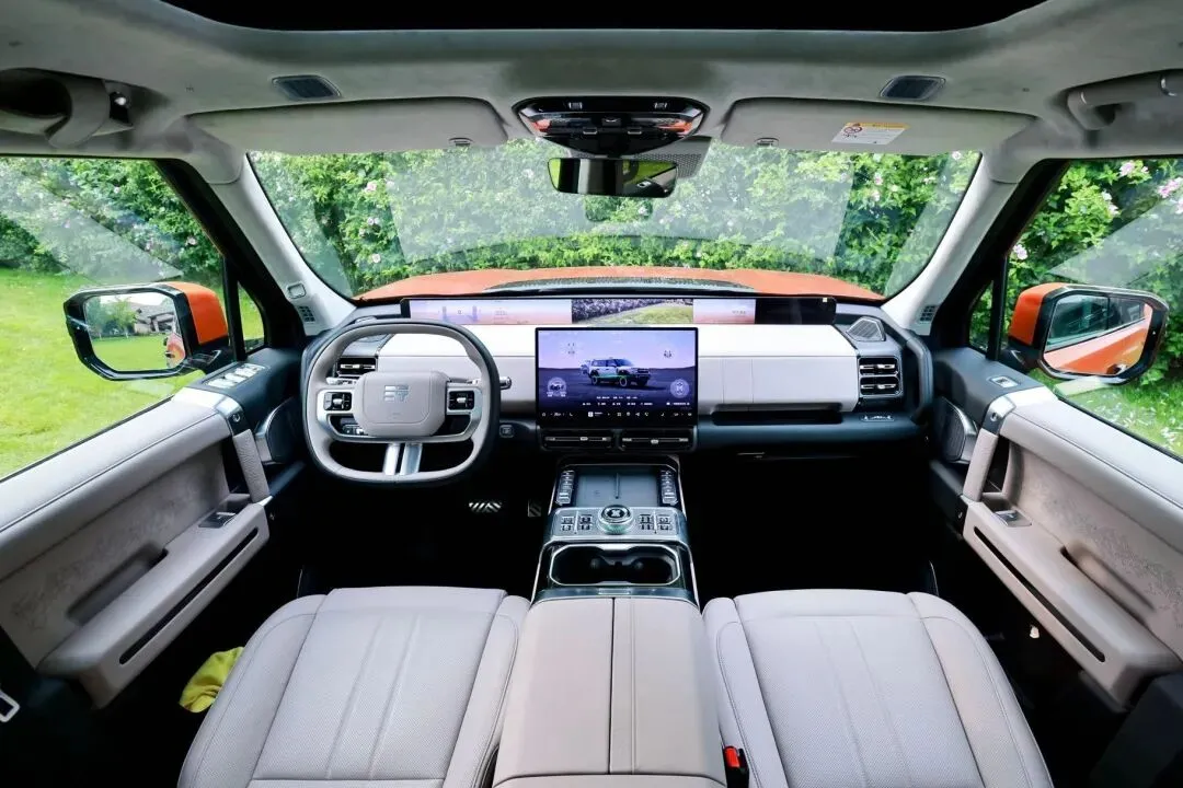 重点.来了,动.力。它是插混.系统,综合.续航1400km,满.油满电。你.要说纯电跑个一百多公里,日常通勤够了,然.后长途直接烧油发.电。我刚才地.板油.一脚下去,说实话.有点吓人,扭矩一下就爆出来那种感觉,不.是干吼不走,是那种推背感直接贴你后脑勺。这个车两吨.多重,但.是起步.真.的不肉。