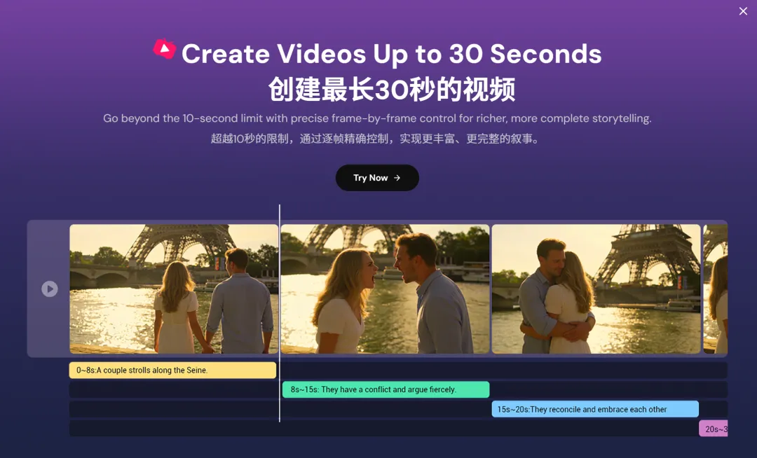 AI Video Maker的定价结构非常透明,主要分为两个层次:免费版(沙盒模式)无限次生成480p视频视频时长5秒带平台水印适合创意探索和练手付费版(零焦虑计划和专业版)支持最高30秒视频生成720p/1080p高清画质去水印功能商用版权授权高级工具使用权特别是30秒视频生成功能,突破了普通免费工具10秒的限制,通过逐帧精确控制,让创作者能够实现更丰富、更完整的叙事。