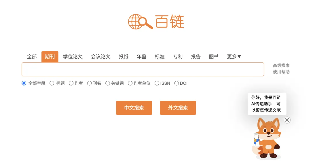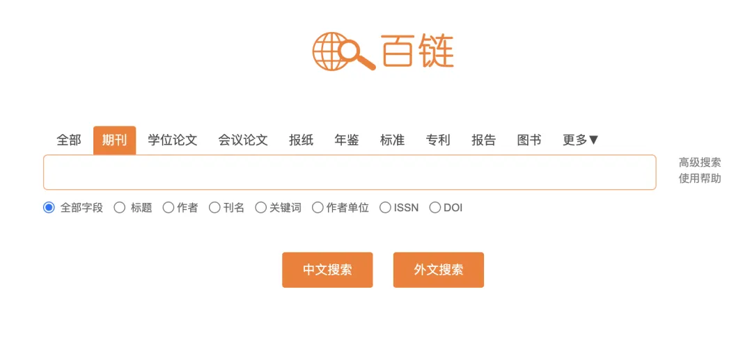 百链首页支持选择频道,大家在搜索文献时,可以根据自己的需求选择不同的「文献类型」(期刊、学位论文、图书等);