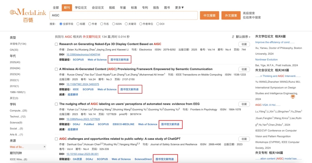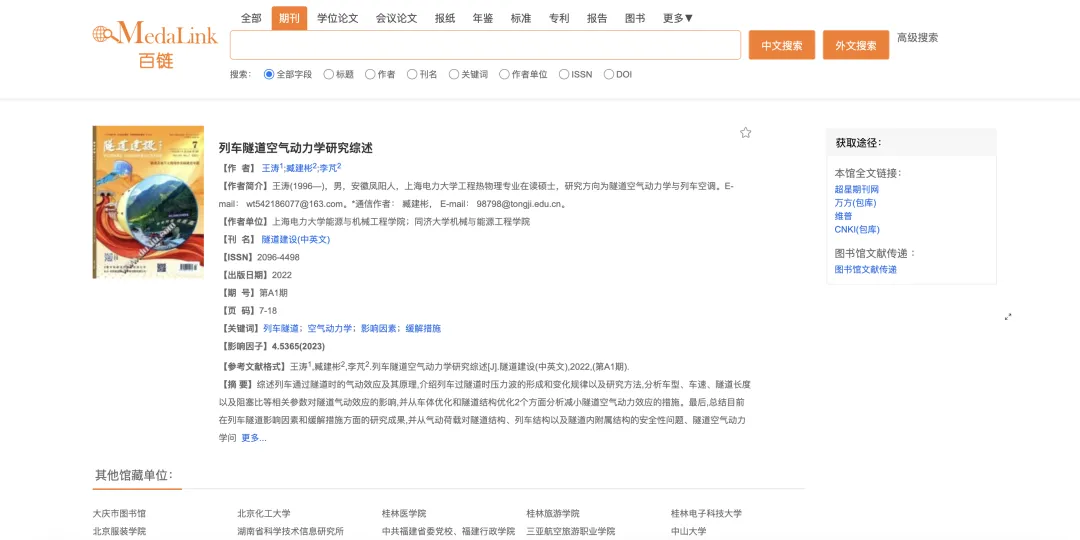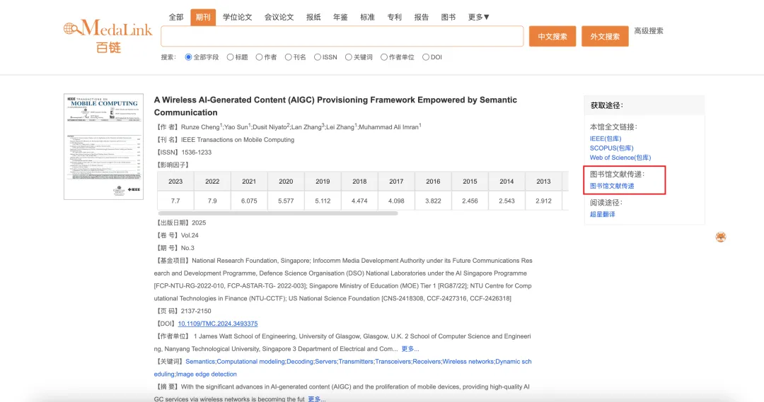 当你在百链平台完成文献检索后,无论是在检索结果列表页,还是进入文献详情页 ,都能找到「图书馆文献传递」这一入口。