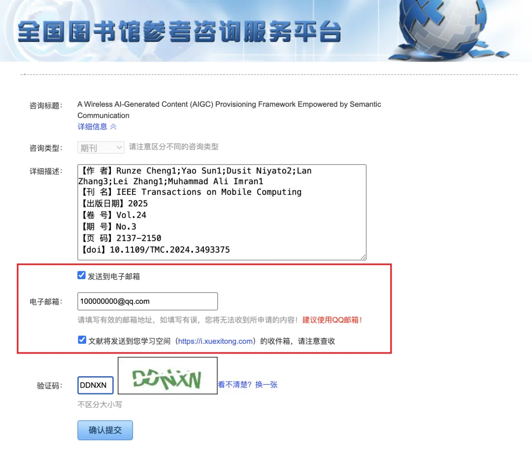 点击文献传递按钮后,会弹出填写信息的界面,此时你只需填入常用的邮箱地址(建议使用 QQ 邮箱),也可以勾选将文献发送到学习空间收件箱,点击确认提交,就算完成了一次文献申请;