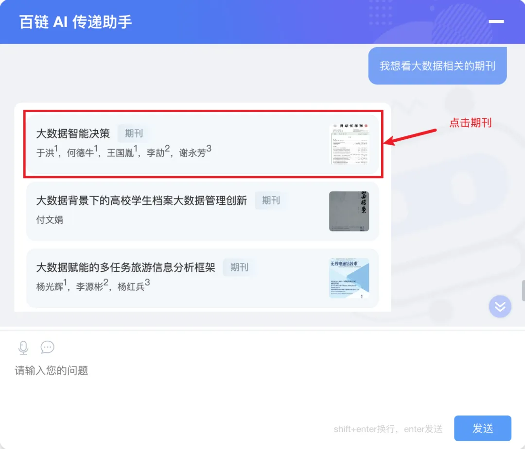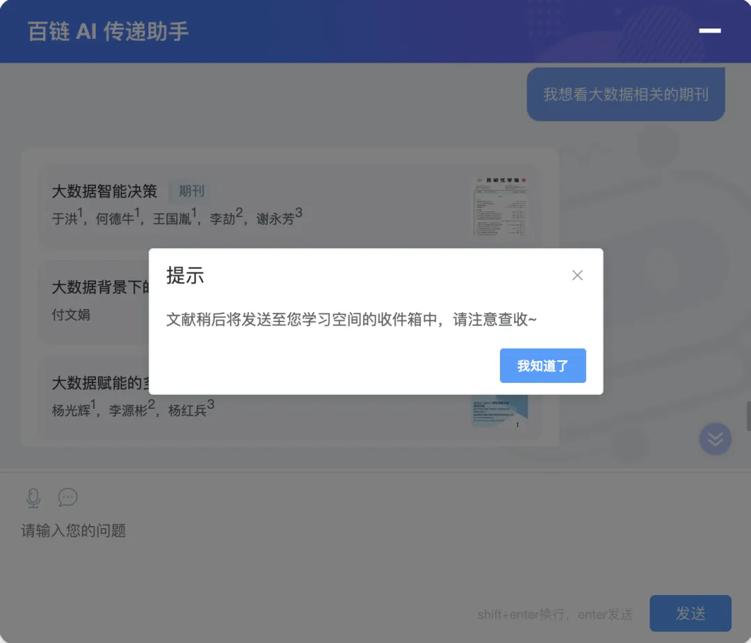 百链全新上线 AI 传递助手 ,通过即时对话式申请、关键词智能推荐、深度文献分析,让学术探索变得更智能、更高效!