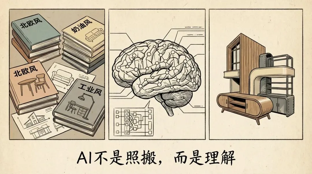 要理解AI为什么不只是工具,我们得先搞懂它是怎么”学会”设计的。AI是怎么”学会”设计的?你有没有想过一个问题:一个刚入行的设计师,是怎么成长为设计大师的?