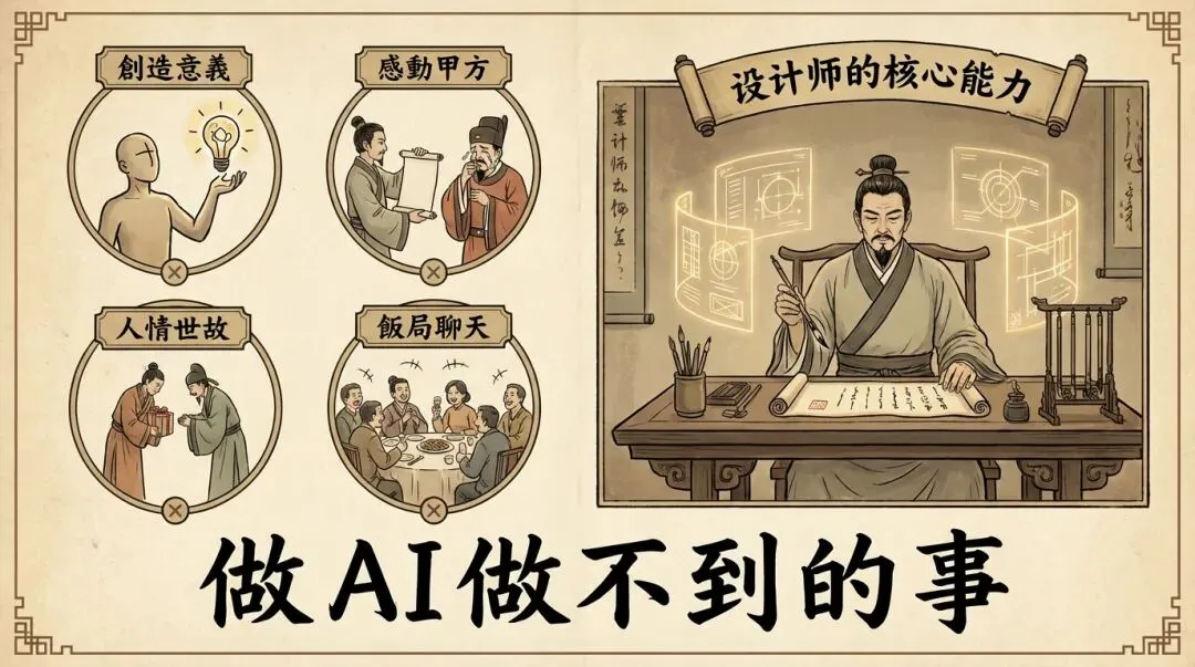 AI做执行,设计师做创意。AI给选项,设计师做判断。AI回答”怎么做”,设计师回答”做什么”和”为什么”。