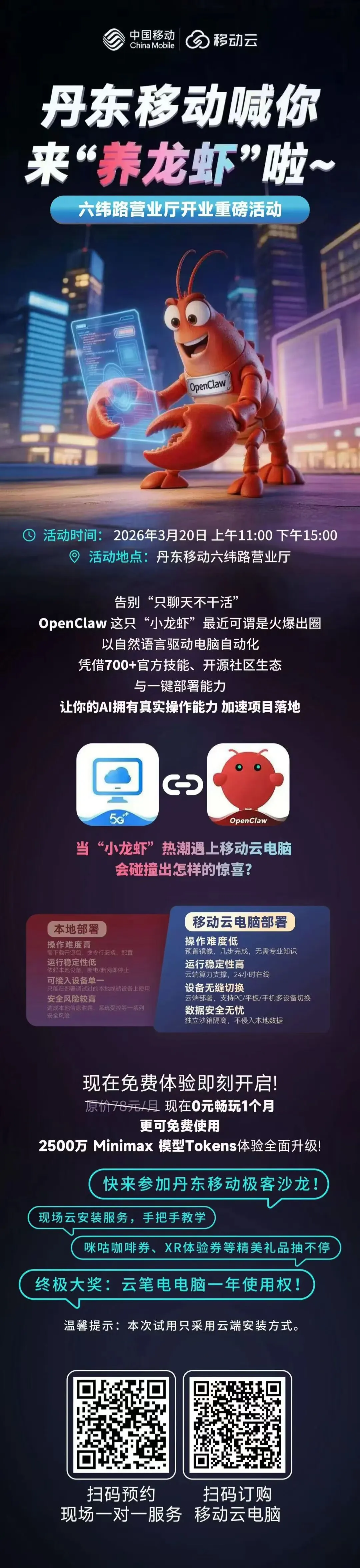 丹东移动喊你来“养龙虾”啦!云上AI助手免费领,现场一对一教学! 丹东移动喊你来“养龙虾”啦!云上AI助手免费领,现场一对一教学! 丹东移动 · 移动云电脑 让AI真正为你所用! 温馨提醒:OpenClaw为第三方功能,您在使用前、使用时需自行承担网络及数据安全风险。因使用不当导致的数据泄露、文件丢失等问题,本公司不承担相关责任。