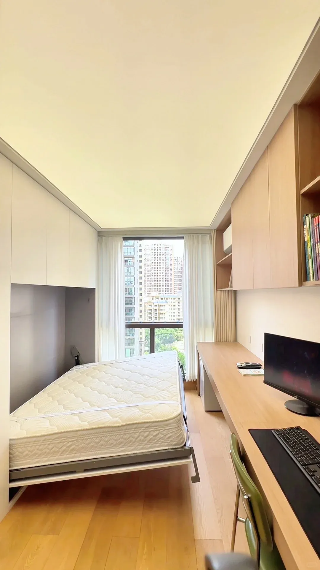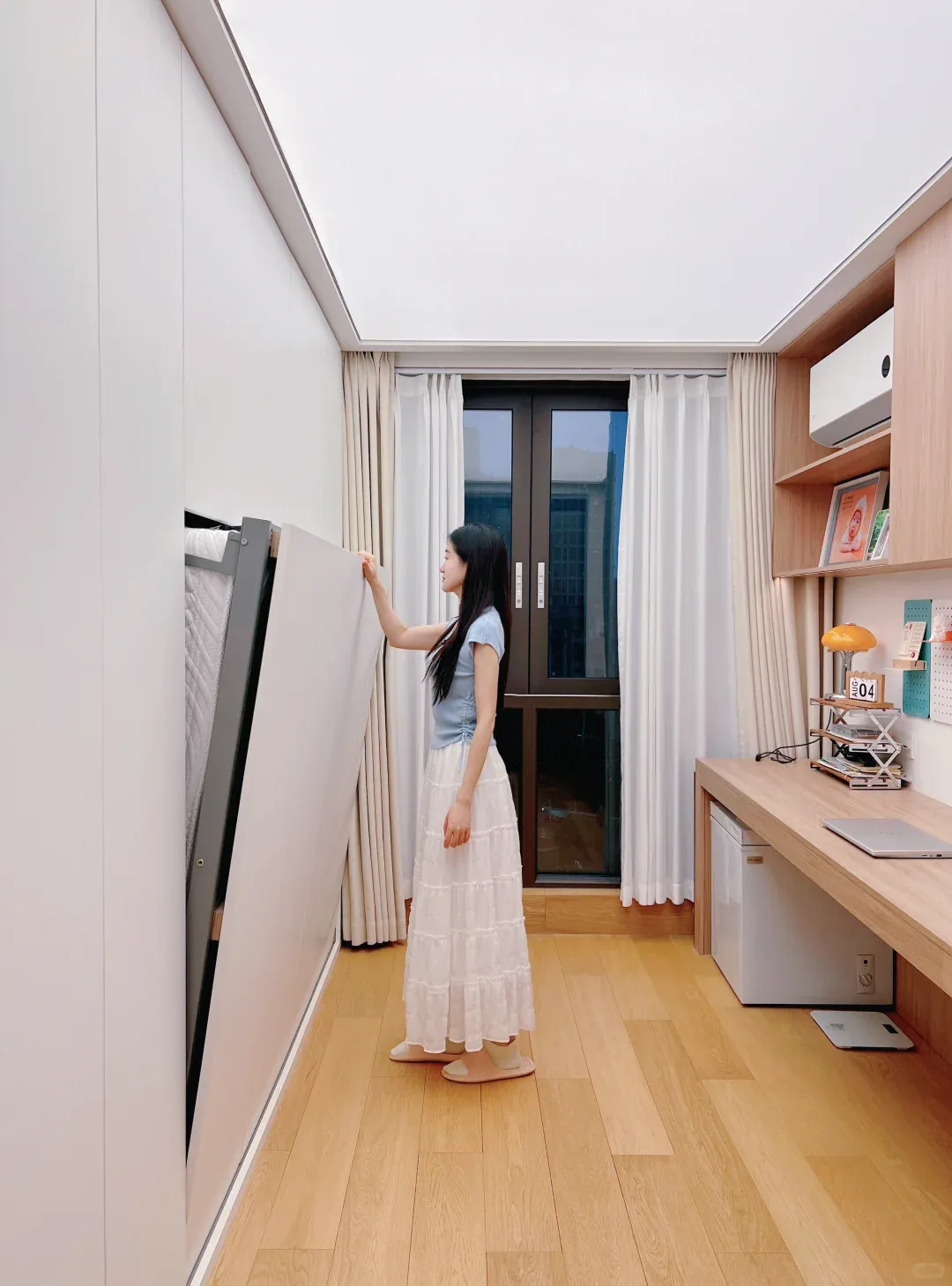 现在?我在次卧墙面装了一个壁挂式折叠床(也叫墨菲床)。