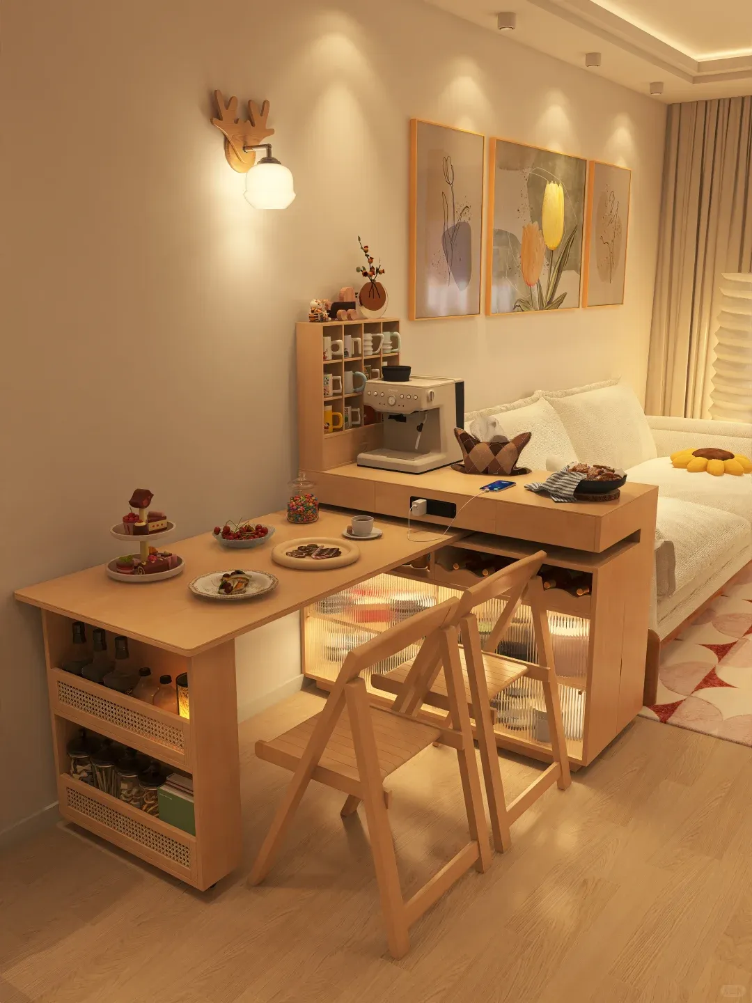 平时收成60cm宽,靠墙放,当边几用,放咖啡机、绿植;