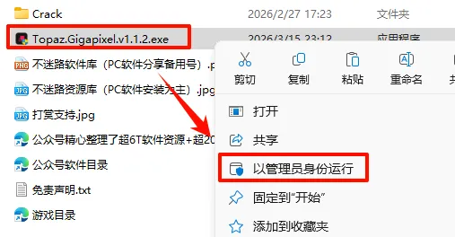 2.打开刚刚解压的文件夹,鼠标右键点击“Topaz.Gigapixel.v1.1.2.exe”选择“以管理员身份运行”