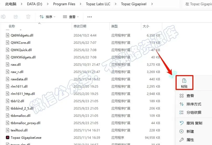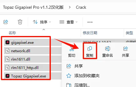 10.返回之前解压的“Topaz Gigapixel Pro v1.1.2汉化版”文件夹,双击打开“Crack”文件夹,选中全部文件,鼠标右键点击“复制”
