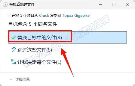 13.点击“替换目标中的文件“(若提示需要管理员权限,勾选“为所有…”,点击“继续”)
