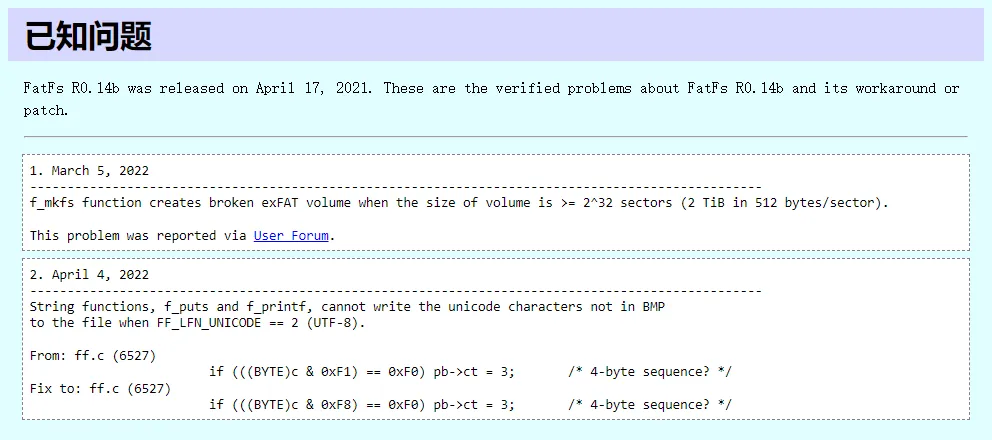 扫描下方二维码或复制链接到浏览器查看:记录着有关Fatfs最新版本的已知问题以及问题的解决方法或补丁。