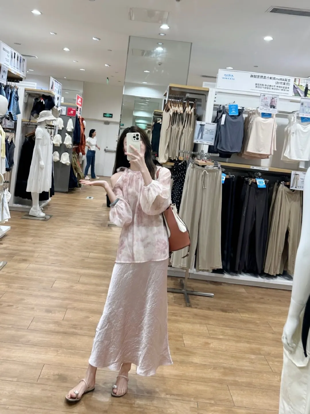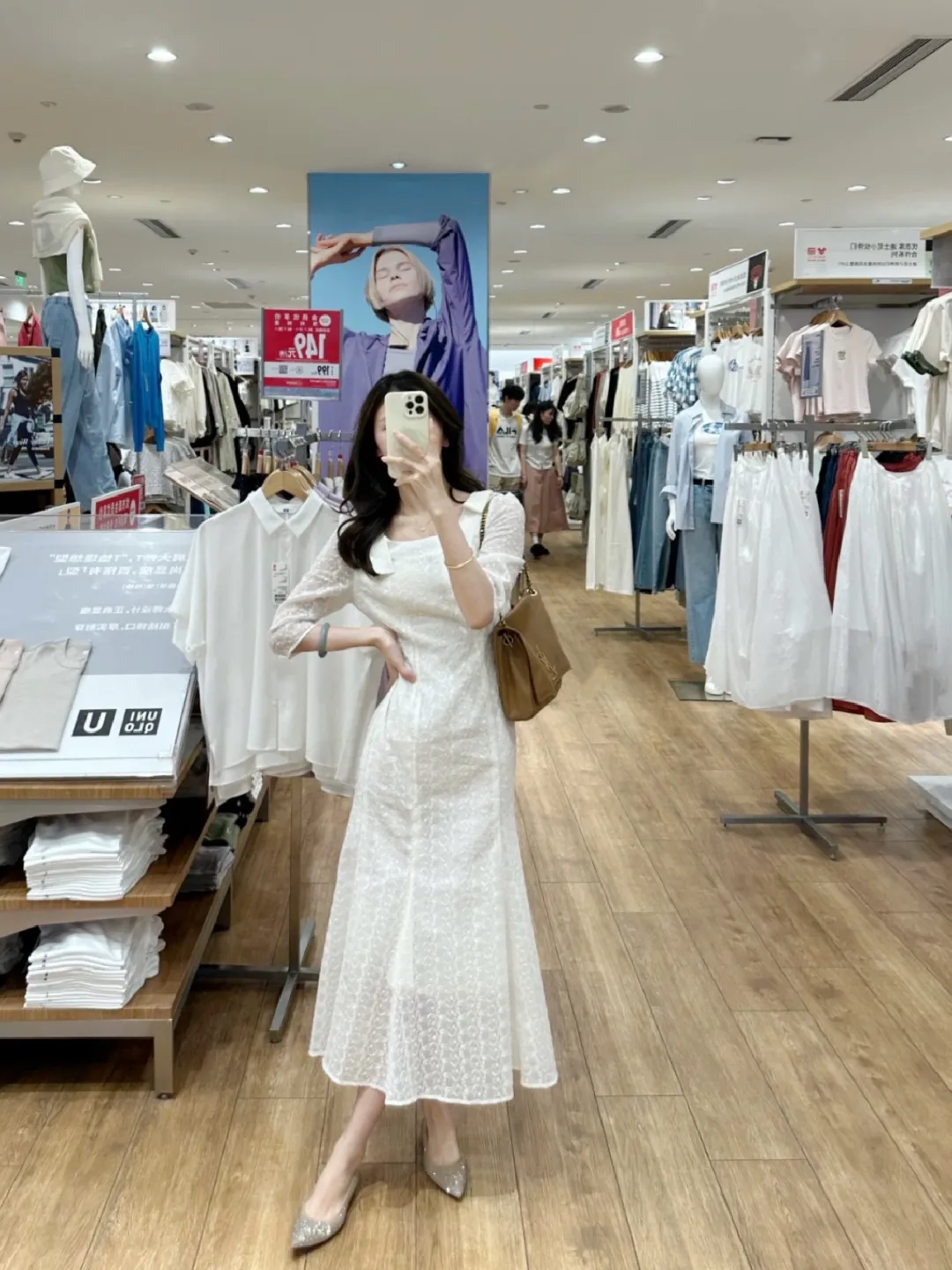 白色蕾丝连衣裙如月光纺成的网,裹着纤细的腰身,米色链条包垂在臂弯像一块温润的和田玉,银色亮片鞋在木质地板上折射出细碎的星芒。粉色扎染上衣晕开温柔的涟漪,同色系半裙垂坠如流水,凉鞋的细带缠绕脚踝,似系住了夏日的风。商场里的衣架挂着各色衣物,背景的海报与行人衬得这身影愈发从容。