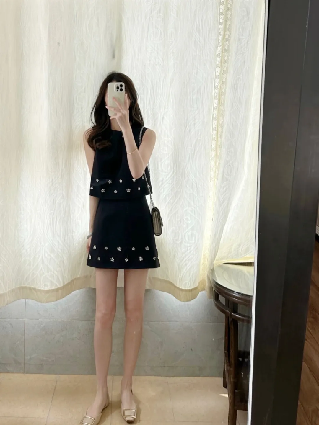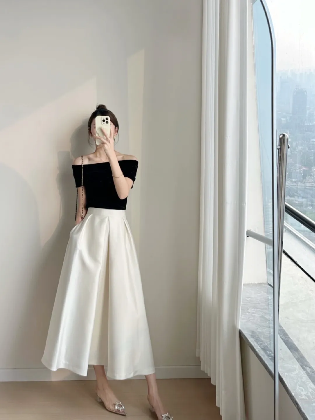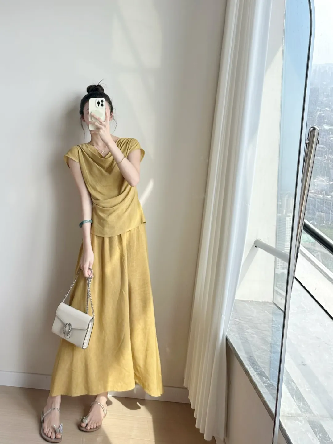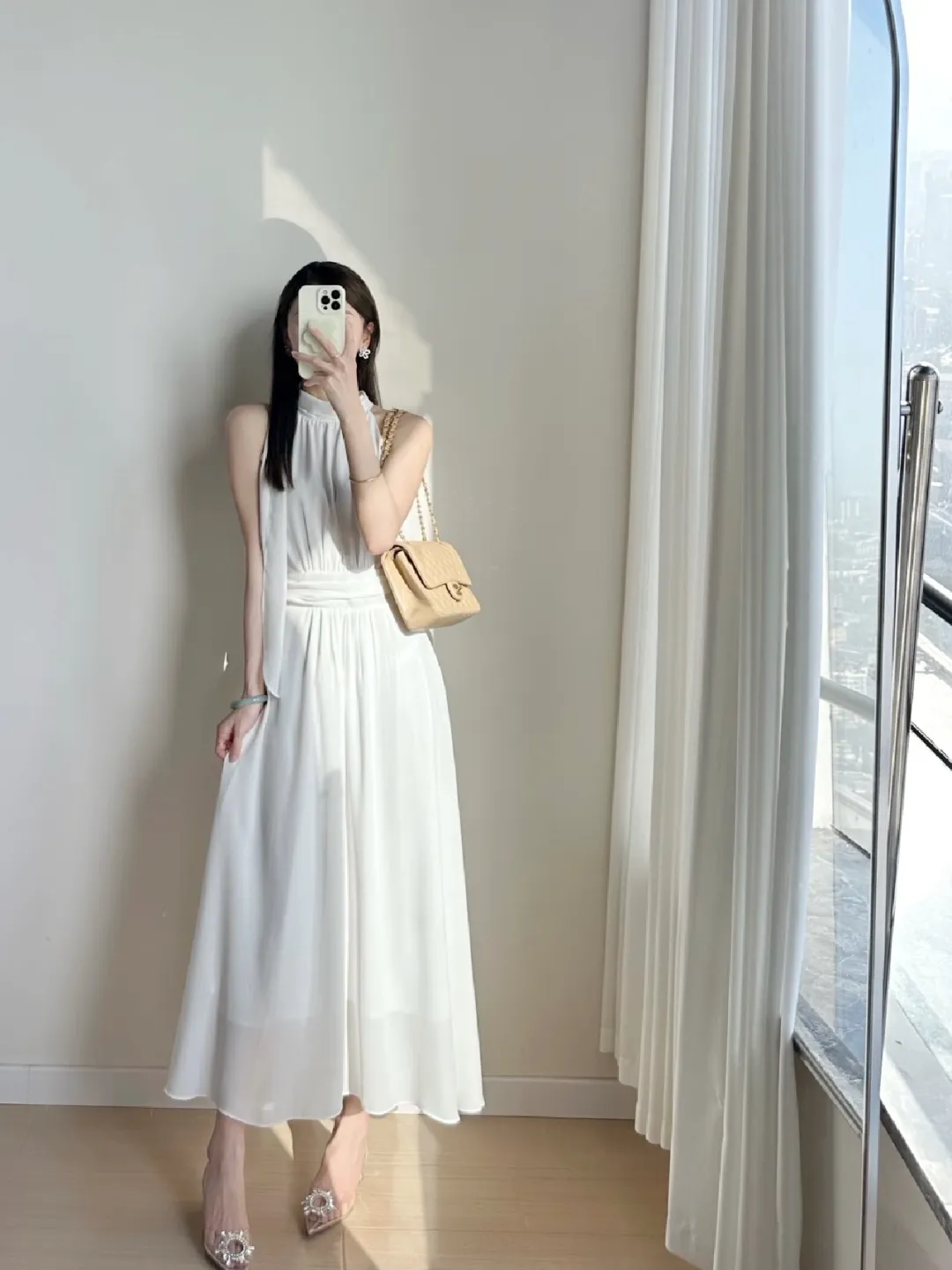 转身至窗边,黑色露肩上衣如天鹅绒般贴合肌肤,白色阔腿裙似云朵般散开,玻璃栏杆外是朦胧的城市剪影。白色挂脖连衣裙在阳光下泛着柔光,米色小方包的链条闪着细碎的光,脚踝的水钻鞋像落了一地星子。姜黄色套装像秋日的暖阳,白色链条包添了几分清爽,裙摆随步伐轻摆如麦浪翻涌。