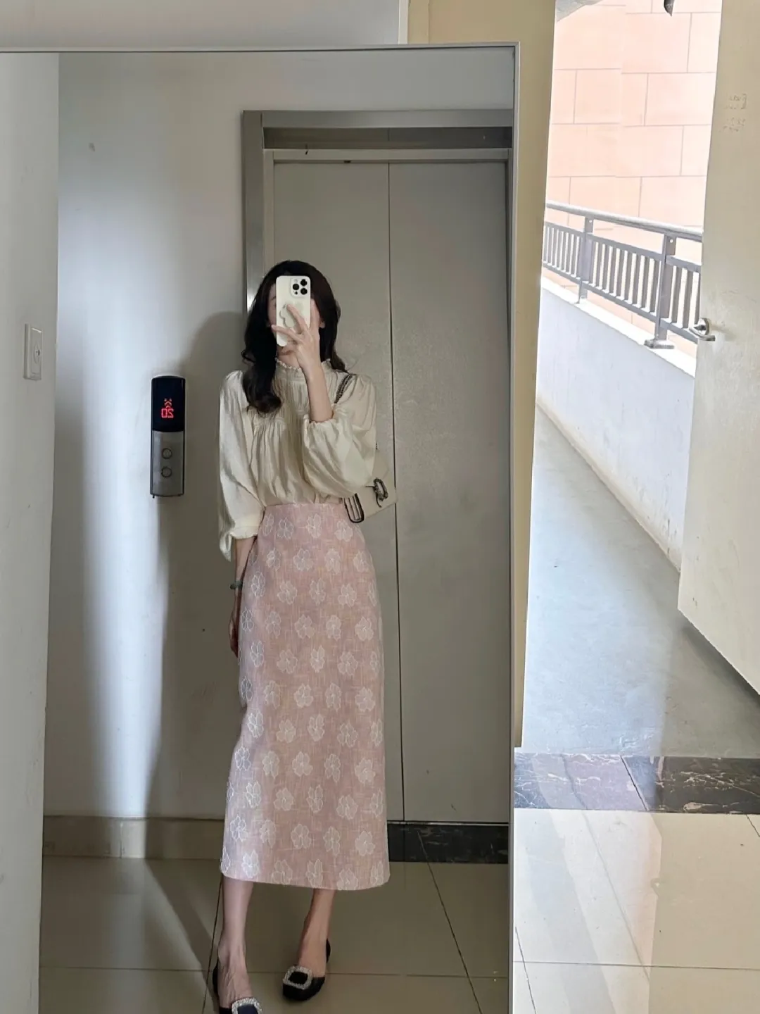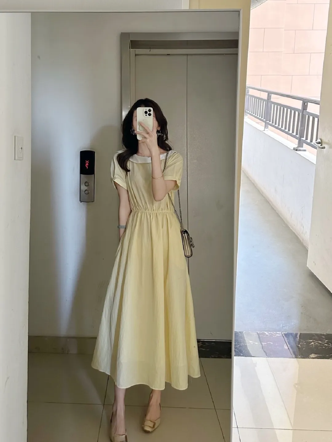 电梯前,米色衬衫配粉色花纹半裙,裙摆的图案如春日繁花;淡黄色连衣裙领口的白边似奶油般细腻,垂坠的裙摆在瓷砖上投下温柔的影。每一套穿搭都像一首凝练的诗,把日常琐碎织成了优雅的注脚。