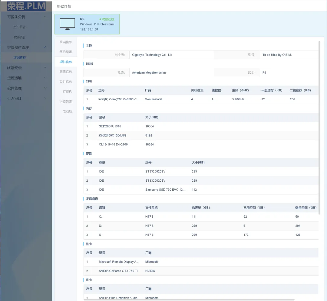 全维画像:从CPU、内存到主板BIOS,从已装软件到网络IP,系统自动采集并生成终端“全息档案”。