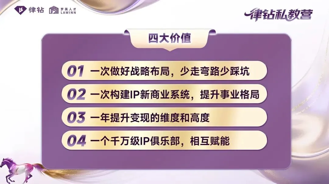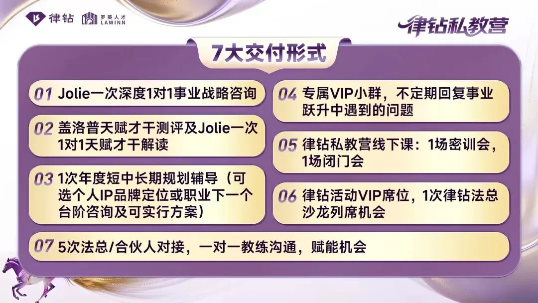 但这只是开始——为延续这份成长势能,解决“短期学习难落地、长期发展缺陪伴”的核心痛点,律钻创始人Jolie携18年全球法律人才服务经验,重磅推出「律钻私教营」——以“四大价值+五大理由+六大权益+七大交付”全方位护航,陪你用一年时间,完成从“专业人”到“事业强者”的蜕变!