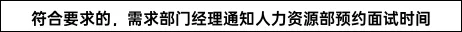 2、人力资源部选择适当的招聘渠道发布招聘信息,收集人员资料(应聘人员填写《求职申请表》)收到应聘资料后,进行初步的筛选,然后交部门经理,由部门经理根据岗位任职资格确定需面试的人选。人力资源部负责通知初选合格人员来公司进行面试、笔试。