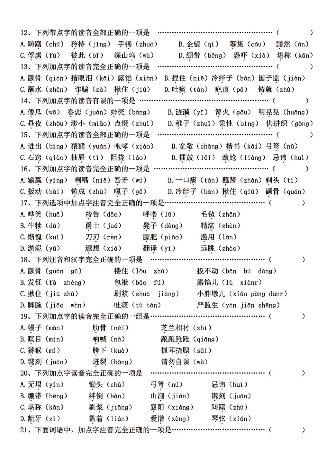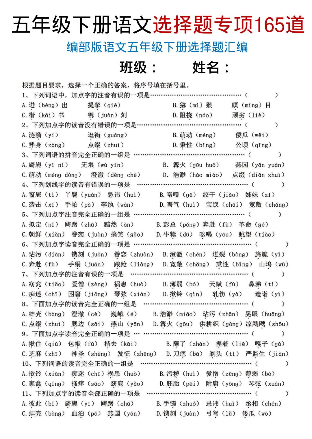 五年级(下)语文选择题专项165道电子版PDF,20页,免费下载