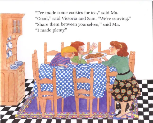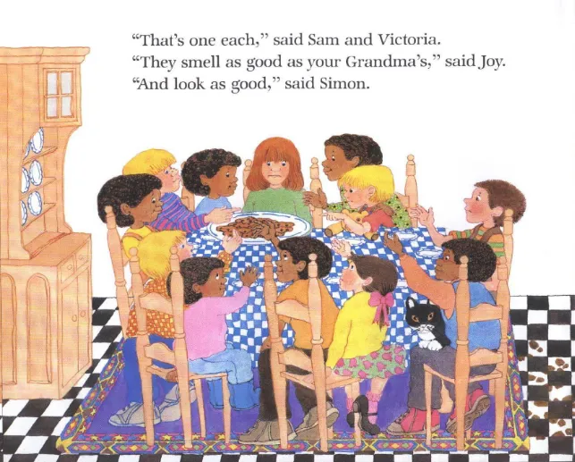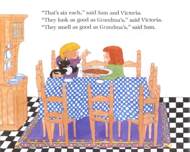 绘本故事从妈妈烘焙的12块饼干开始,刚开始是2个小朋友,每个人可以分到6块饼干,随着门铃一次次响起,Sam和Victoria一起向客人分享妈妈烘焙的饼干,每次的句式很简单,并且在不断地重复。