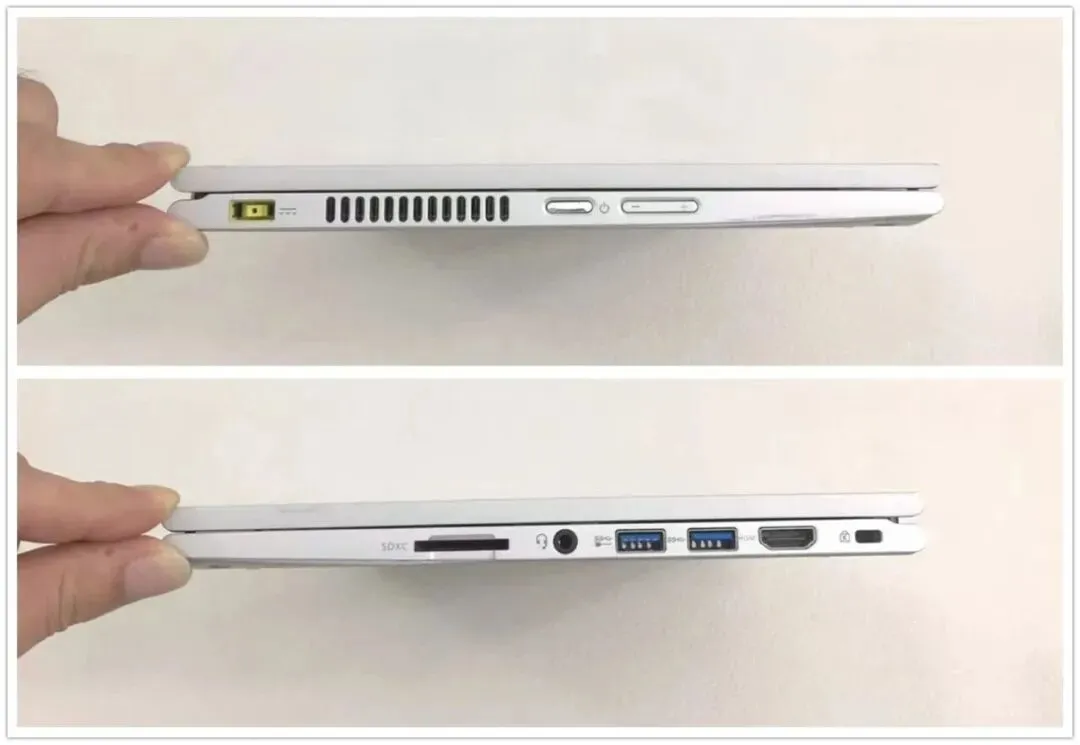 接口分布简单,左侧是方口电源、旁边电源键和音量键,盲摸容易,右侧是SD卡槽、耳机孔、一个USB 3.0和一个HDMI,U盘插上拷文件,会议室投个屏能用,没有Type-C是个点,不过用方口转C口的诱骗线能接PD充电器,带着手机充电头就能给它补电,原装砖头可以不带,通勤包能再轻一点,出门的线材也少一根。