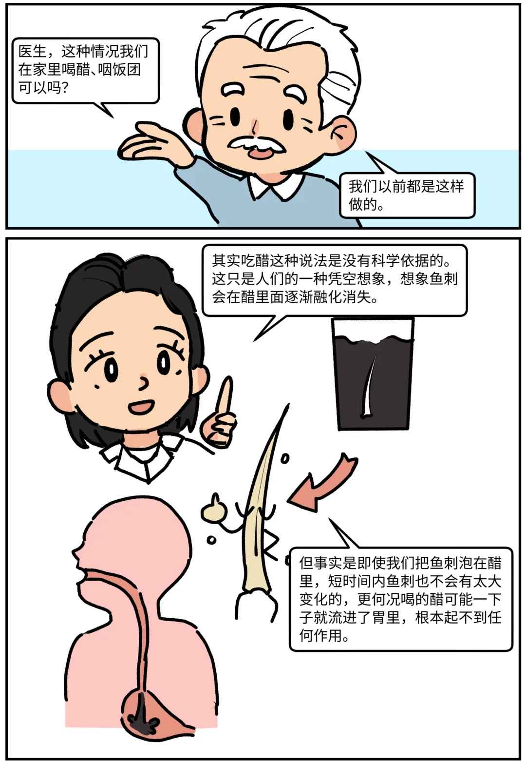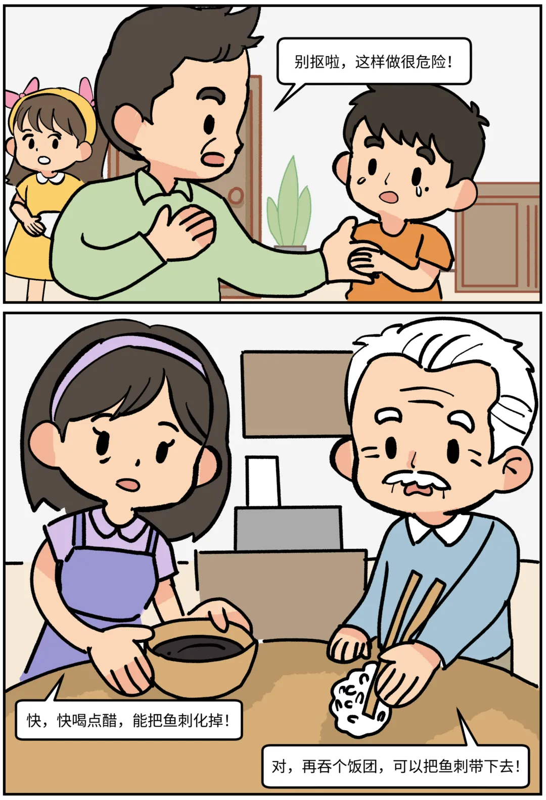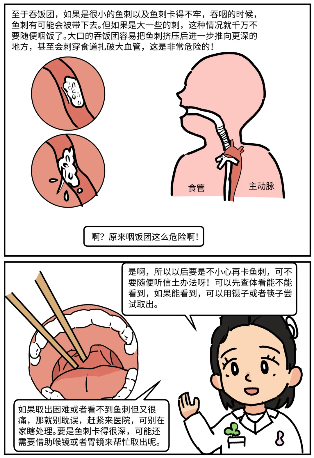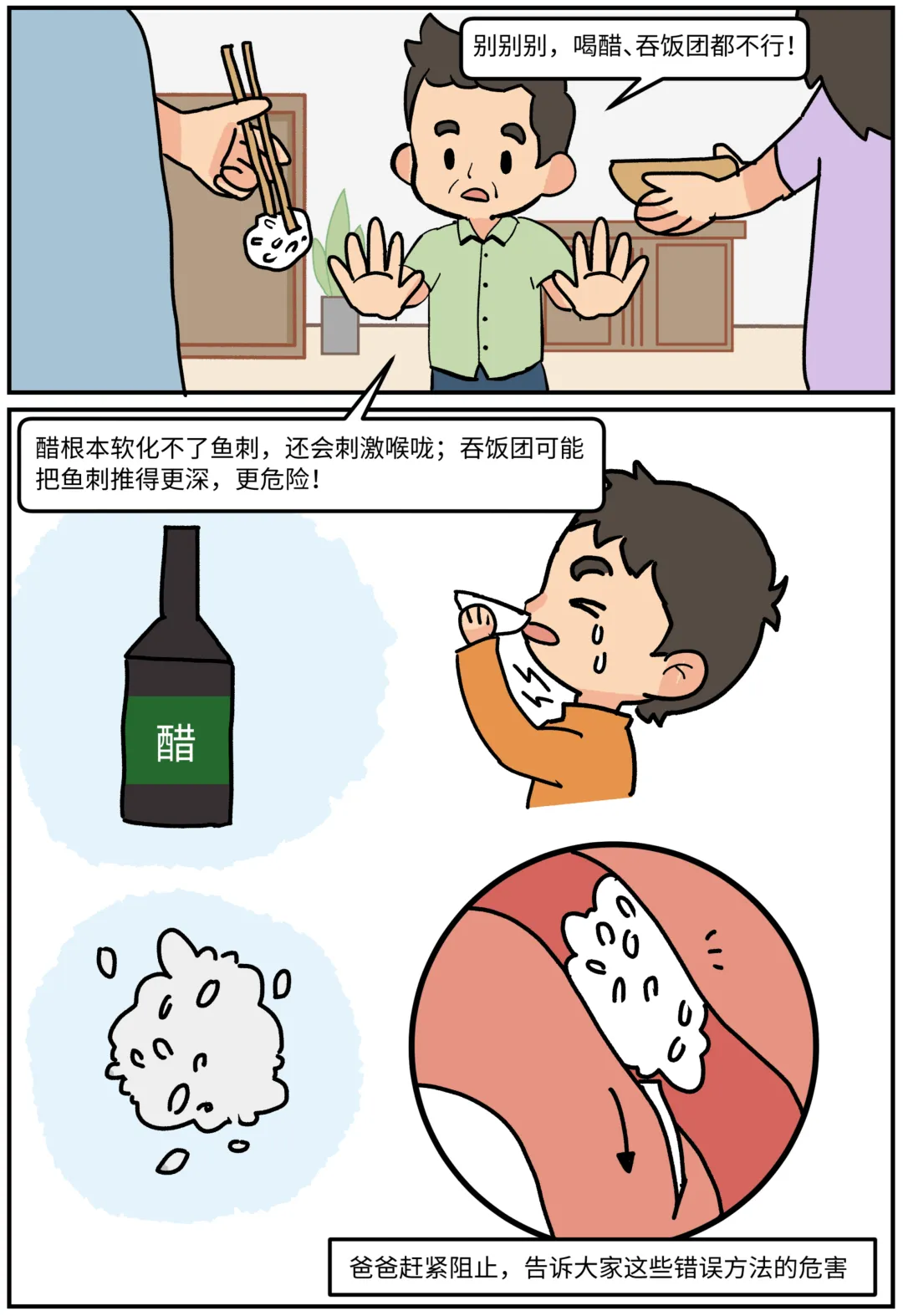 鱼刺卡喉怎么办?科普漫画《刺客大作战》 鱼刺卡喉,第一反应是喝醋还是吞饭?其实这些都不对!当吃鱼被卡住,这些习以为常的“土方法”可能正在帮倒忙!看图就能秒懂:哪些做法是雷区❌,怎样做才安全✅。生动有趣,一看就会! 作者:许满、庞宇峰 绘画:李仲陶